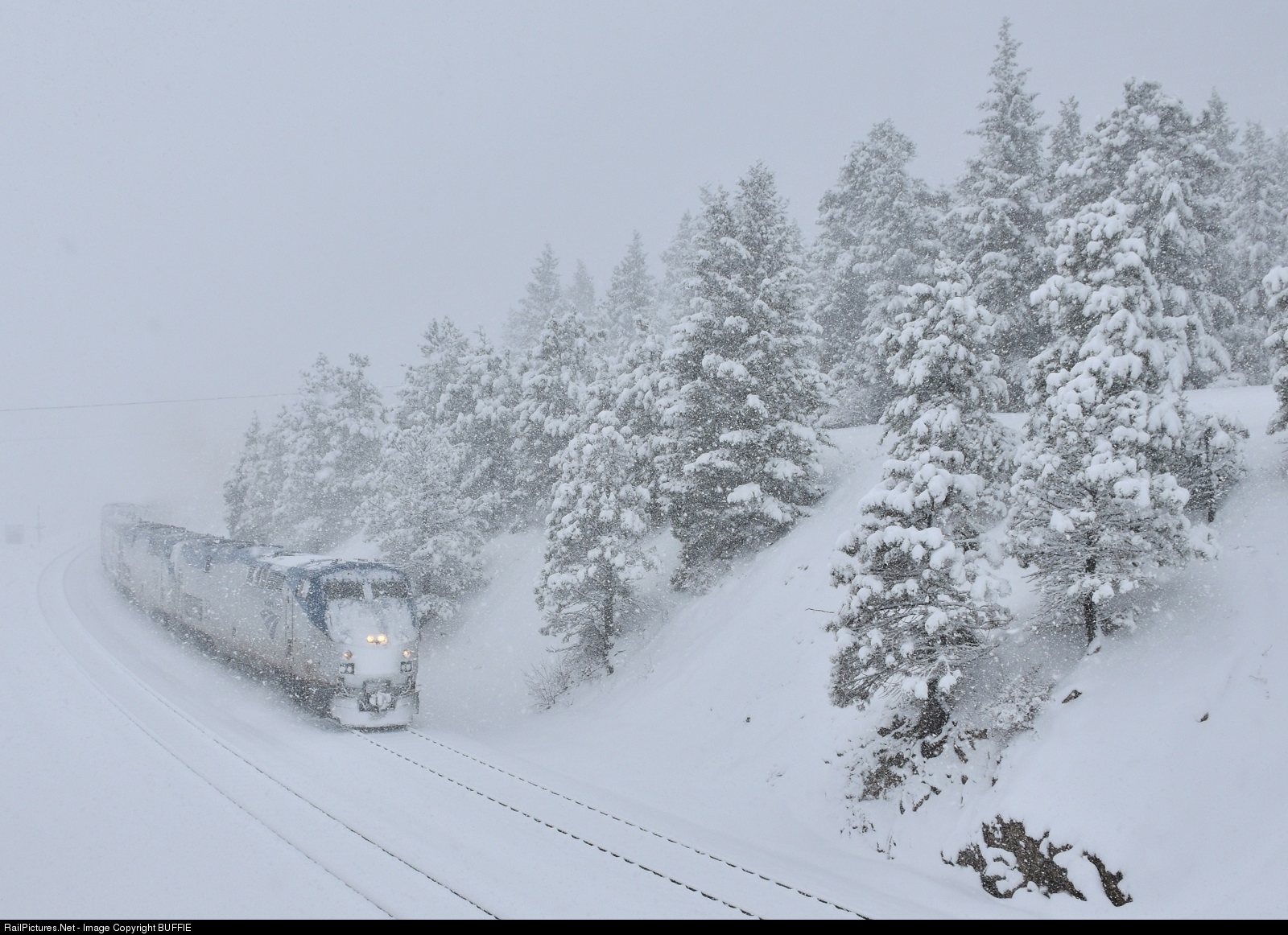 The Abominable Zephyr, lead by Amtrak #33 (P42DC) rounds the corner of Crescent under one of the heaviest blizzard to hit these mountains in years.