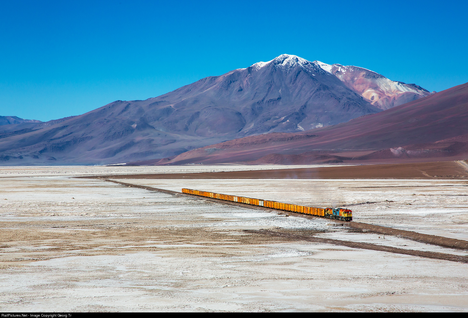 EMD GT22CU-3 (rebuilt GR12 from 1964, former FNC # 422, former STF # 1222 ) # 2404 and Clyde Engineering GL26C-2 # 2004 (former Queensland Rail #2106 built 1971) of the FCAB are pulling the empty boxcar train from Antofagasta to Bolivia over the Salar de Ascotan towards the chilean/bolivian border station of Ollagüe, on about 3730 meter a.s.l. In the background is the 5846 meter high stratovolcano Cerro de Azufre.