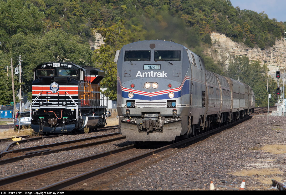 Amtrak Phase 4 paint scheme Engine 184 leads train 313 past Union Pacific's Southern Pacific Heritage Unit 1996. The 1996 was on display in Pacific Missouri as part of their heritage day festivities.