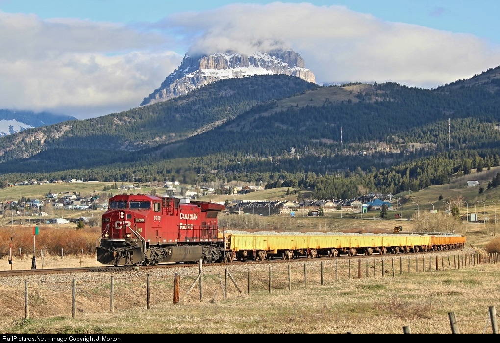 | CP 9768 pulls its train up to the east end of Chinook siding near Blairmore. In all my years of railroad photographing, I've only been out to the Crowsnest Pass a few times. I've always wanted a photo with a train and the namesakes mountain. I found the best place for this was right here, between Blairmore and Coleman. |