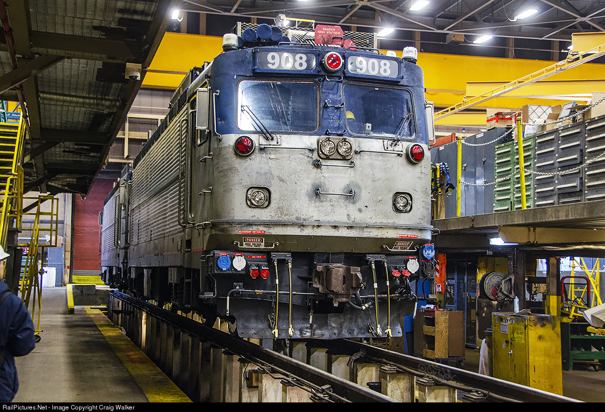 | Being serviced in Amtrak’s Ivy City locomotive shop are AMTK AEM-7ACs 908 and 943. Built in 1980 and 1982, these two electric locomotives are nearing the end of their service on Amtrak, and will be retired in 2016. (Washington DC – January 22, 2015). Photographed on railroad property with permission and full Personal Protective Equipment (PPE). |