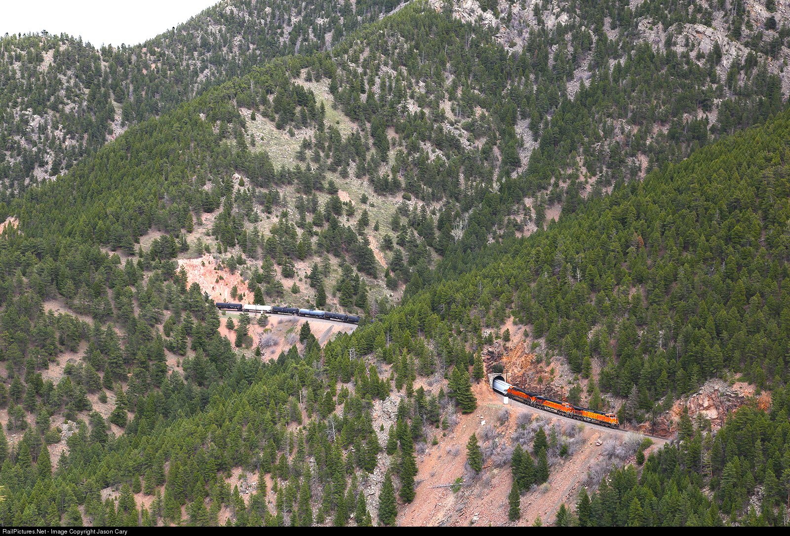 A BNSF westbound slithers thru ex. DRGW's Tunnel district with a fairly short and light manifest. Leaving Tunnel 13 the train is entering the toughest portion of the westbound pull up the Moffat Route. Summer stalls from overheating locomotives, tunnels, grade and curve make this one of the toughest two miles of railroad in North America ....