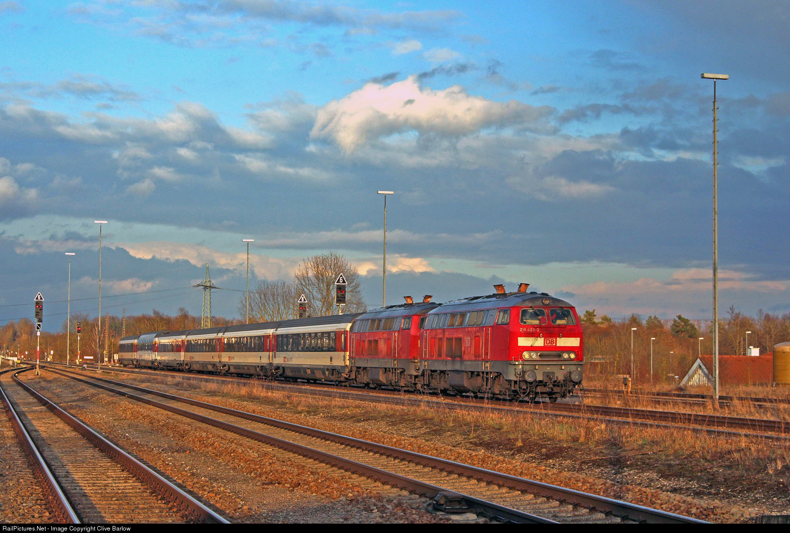 | As the late evening sun floods the sky, Deutsche Bahn 218423 & 218433 pass Kaufering with EC190 1815 München Hbf - Zürich HB on Sunday 1st April 2018. The train had been diverted off of the usual track through platform 3 due to 218446 receiving fire brigade attention on platform 1 because of a large oil loss.