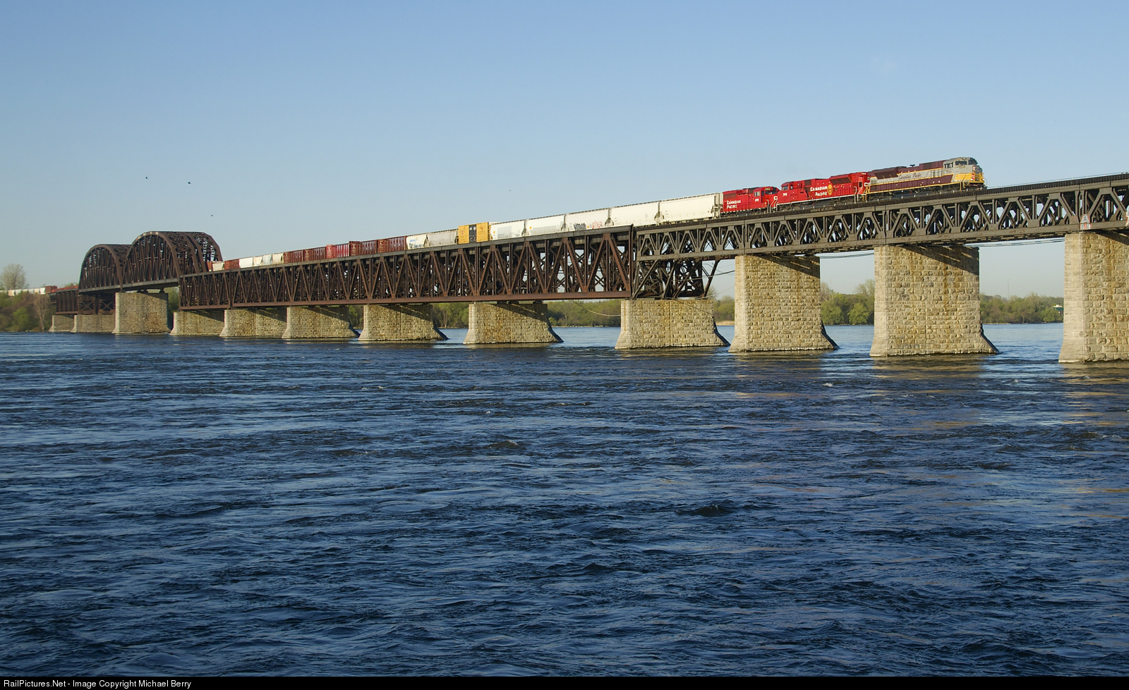 CP 7010, CP 7002 and CP 2253 lead CP 253 over the St. Lawrence River on a gorgeous morning. CP 7010 has led CP 253 a number of times over the past few weeks.