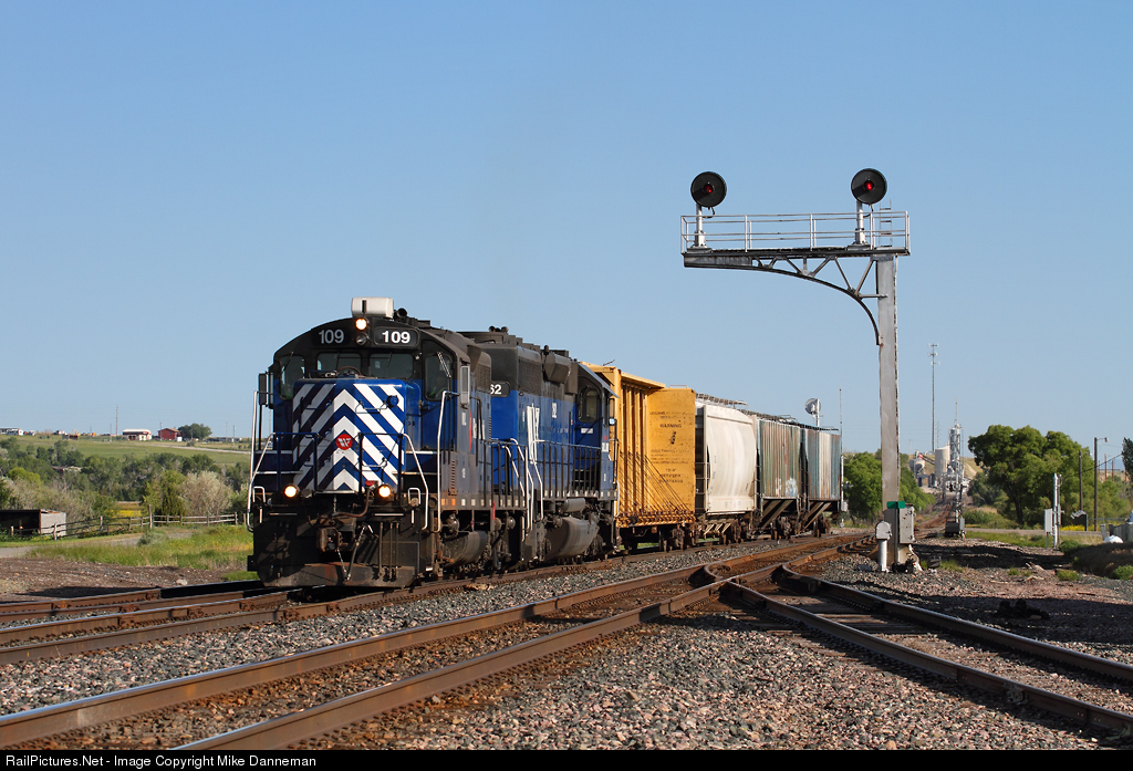 Montana Rail Link’s Helena switch arrives at Townsend, Montana, passing the searchlight signals at the west end of the siding there on July 5, 2018, Veteran GP9 No. 109 and SD40-2XR No. 262 lead an empty centerbeam to be loaded by RY Timber and three cars picked up the cement plant, both located in Townsend.