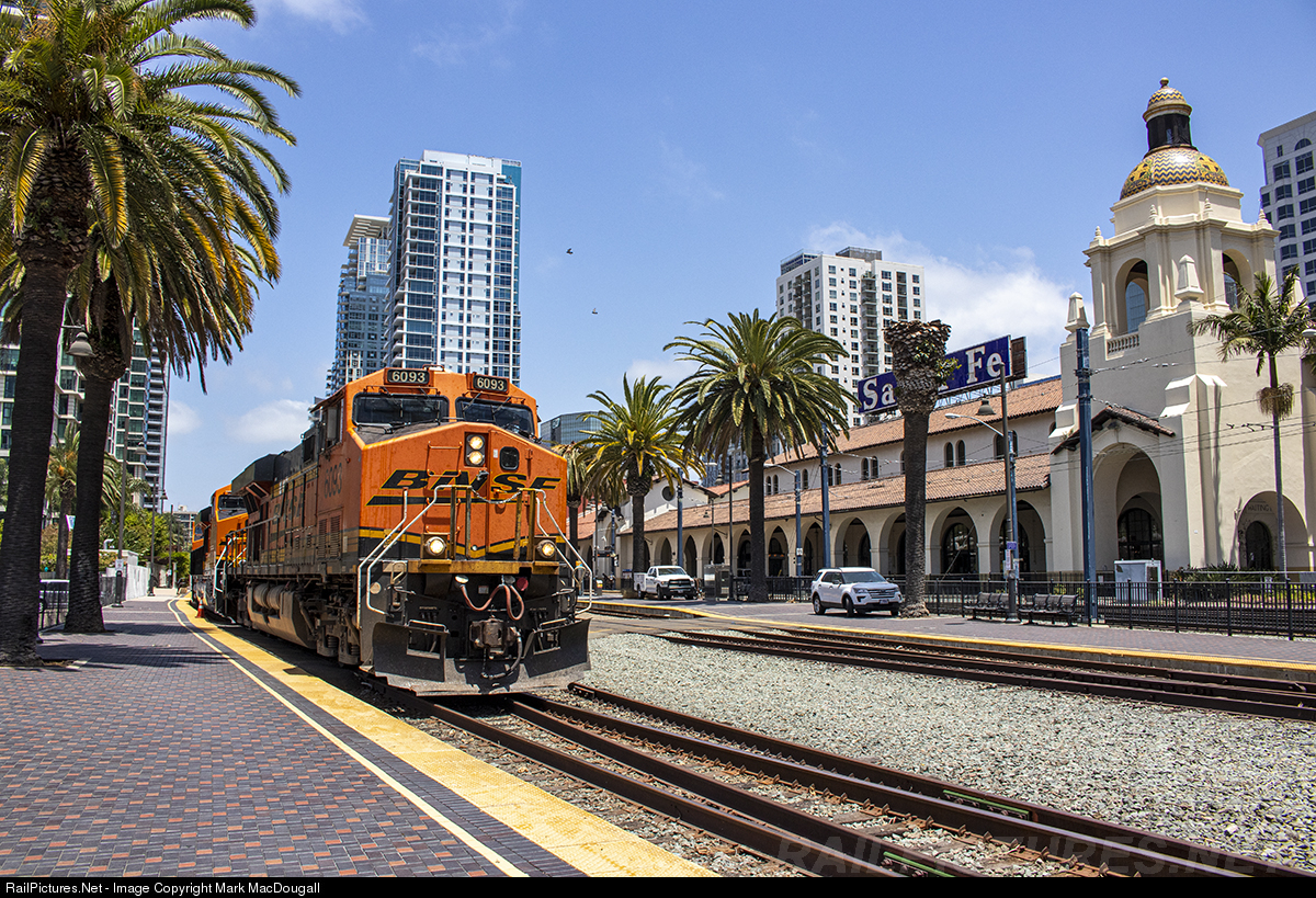| A train of empty autos arrives in San Diego as they crawl through downtown, passing the magnificent Santa Fe depot. |