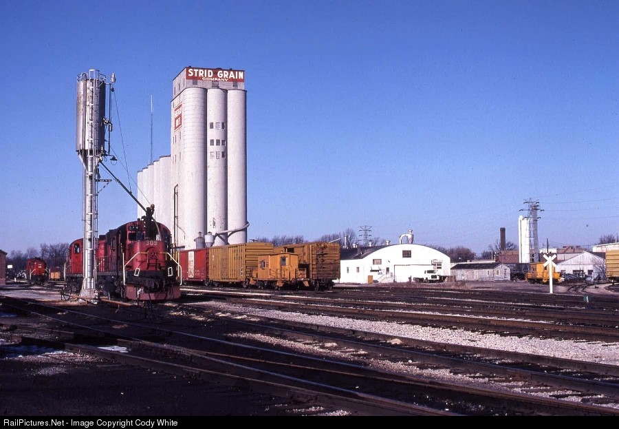 | An overview of GBW Norwood Yard in December 1980. RS11 309 is spotted at the sand tower getting topped off with sand. The Strid Grain elevator was built and owned by the GBW and leased to Strid Grain for many years. Charles Porter Photo from my Collection. |