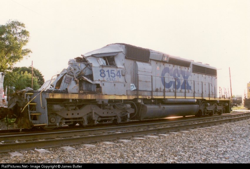 8154 sits on the pit track at the yard office in St. Albans after being involved in a fatal crash on Scary Hill June 7, 1997. 8154 was rebuilt and renumbered 8245.