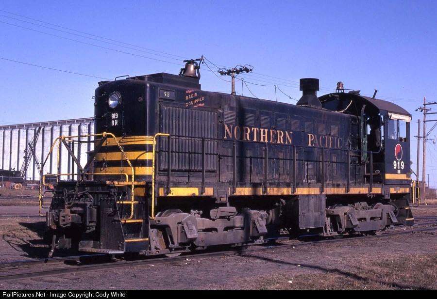 Burlington Northern S4 919 switching in Duluth MN April 1971. BN 919 was built as NP 719 in May 1953 and retired in May 1973. There are a couple hallmarks of the NP on display with this unit including the brass bell with pull rope and the canvas awning above the cab window. In the winter months these switchers had the radiator louvers covered with canvas as well. Robert C. Anderson Photo from my Collection.
