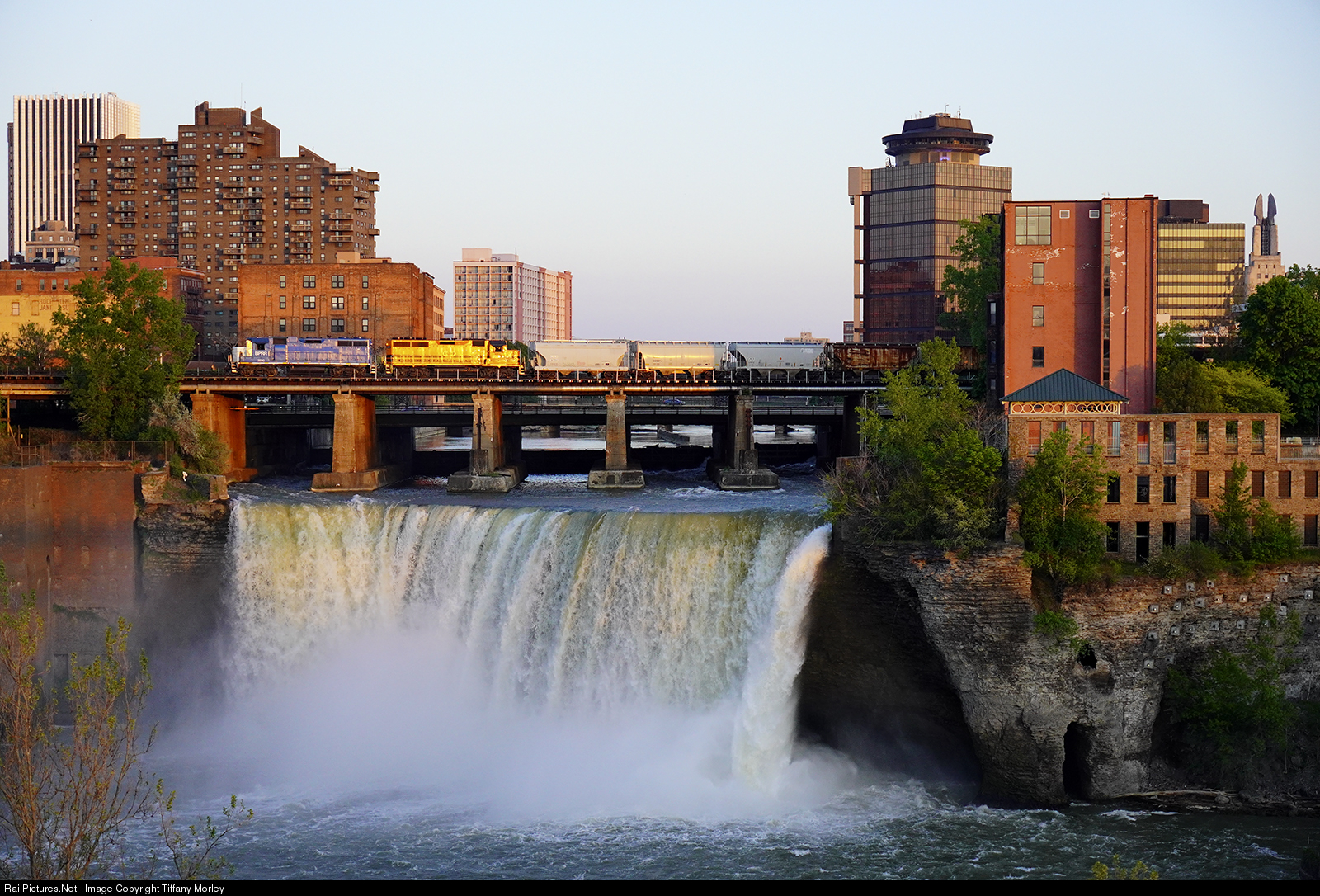 The salt train crosses the High Falls of the Genesee River in the evening and heads East for the CSX Goodman Street Yard.