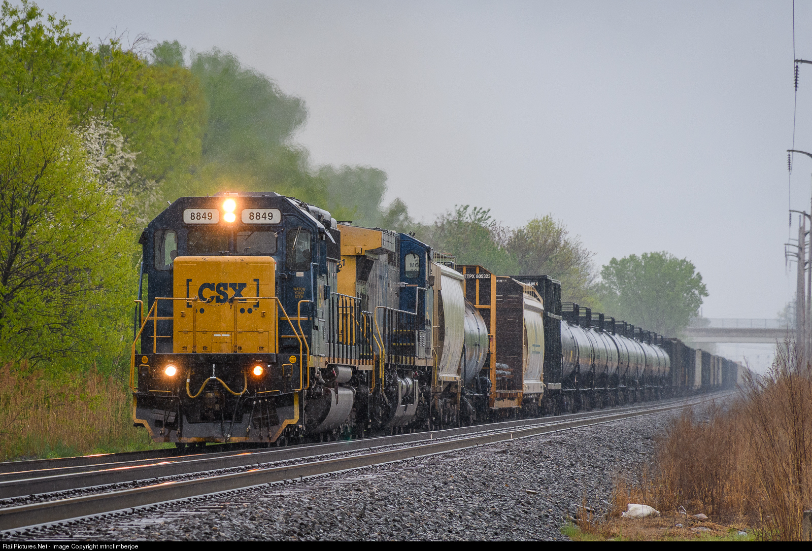 It's a rainy afternoon on the east side of Erie, Pennsylvania as a veteran SD40-2 leads manifest freight Q634 towards Walbridge Road. CSX 8849 is a former Conrail SD40-2 built new for the railroad in 1979.
