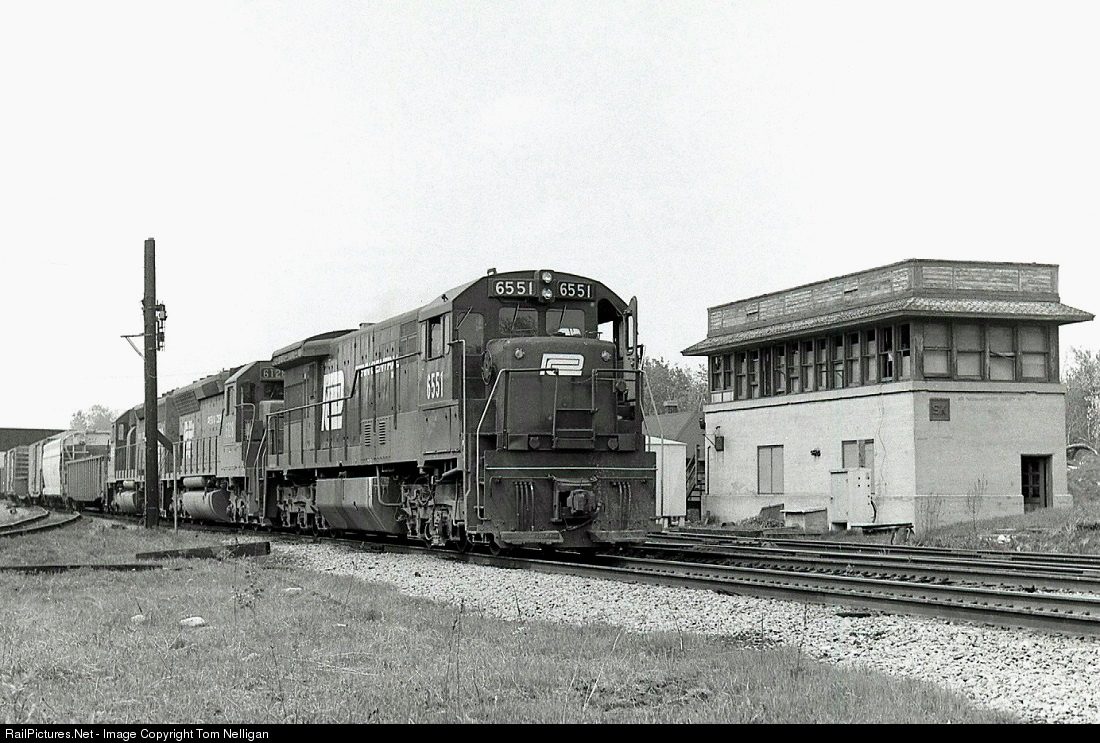 | On its way to Boston, a Penn Central freight that has just departed Selkirk Yard passes shuttered SK Tower, which formerly controlled the junction between the Boston & Albany and West Shore routes. A U33C leads an SD45 and a second EMD on the point. |