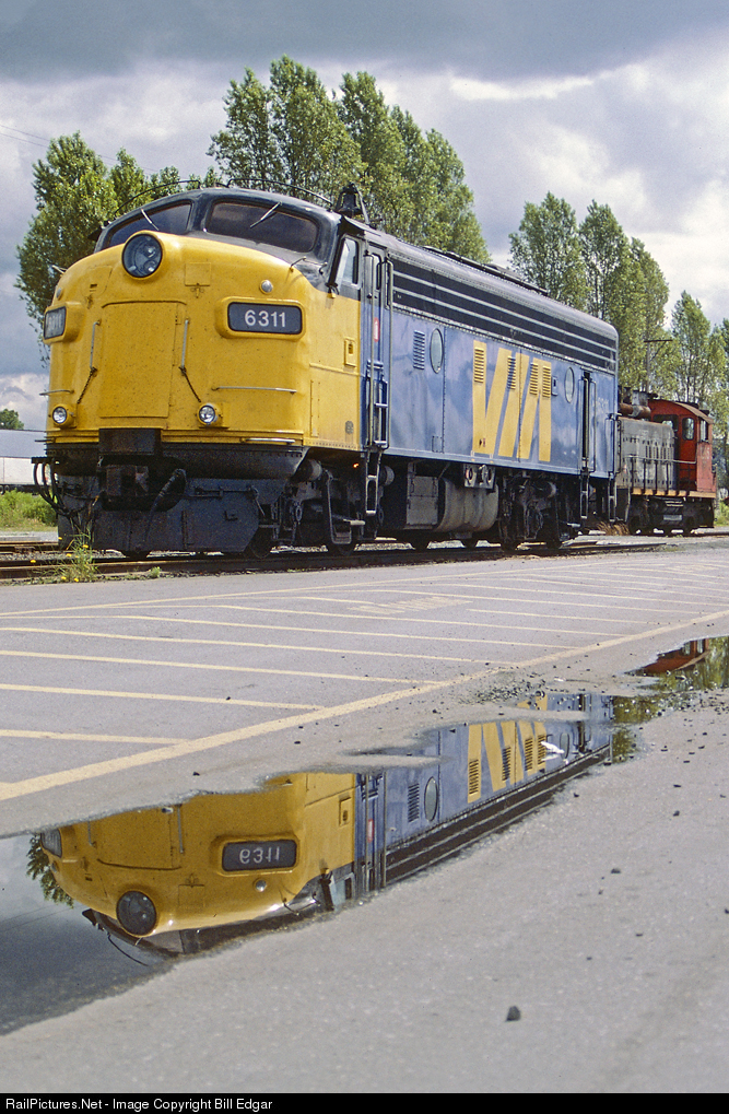 VIA Rail no. 6311, former CN FP9 no. 6529, built in May 1957, reflects on itself at Vancouver's former CN station, now used by VIA and Amtrak. The CN SW1200RS in the background was used for switching VIA power and equipment at the time. The Canadian and Super Continental were still both running daily in 1987, along with a daily Amtrak train between Vancouver and Seattle.