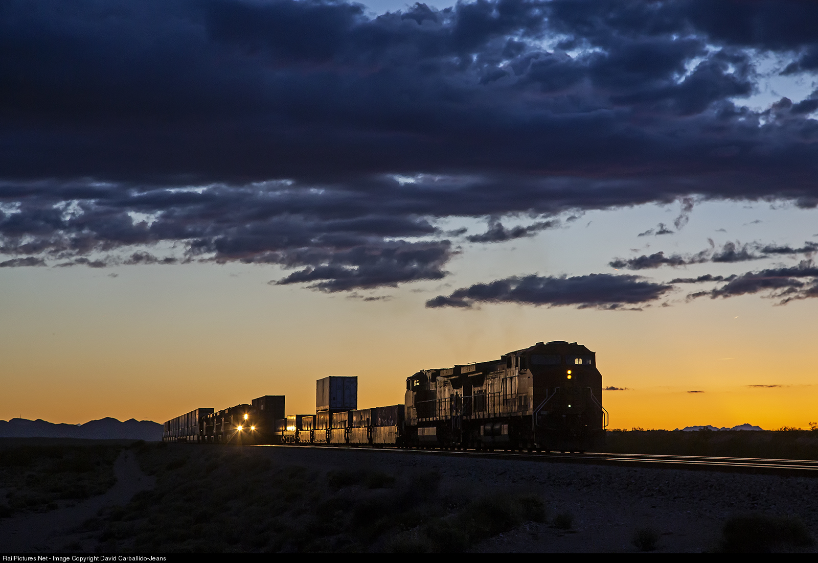 The DP motors shove a heavy westbound stack up the 1.4% grade of Goffs Hill as an eastbound Q train races down the hill into Needles at dusk.