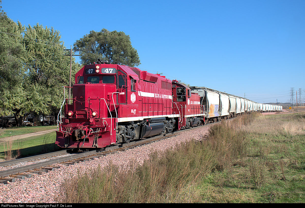 | EE 47 (GP38-2) and EE 7 (SW1200) are working the BNSF interchange on the east side of town. It's an interesting railroad with an eclectic roster of locomotives that all end in the number 7. #47 was built for the Penn Central and also worked for CR, CMNW, GWWR, and the KCS before ending up in South Dakota. |
