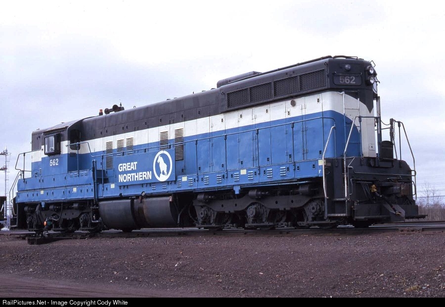 | Great Northern SD7 562 switching the DM&IR interchange yard at Saunders May 1970. Built in July 1952 and rebuilt in June 1968. The Big Sky Blue has held up very well on the 562 considering this paint scheme faded quickly from sun fading and trips through the wash racks. J. David Ingles Photo from my collection. |