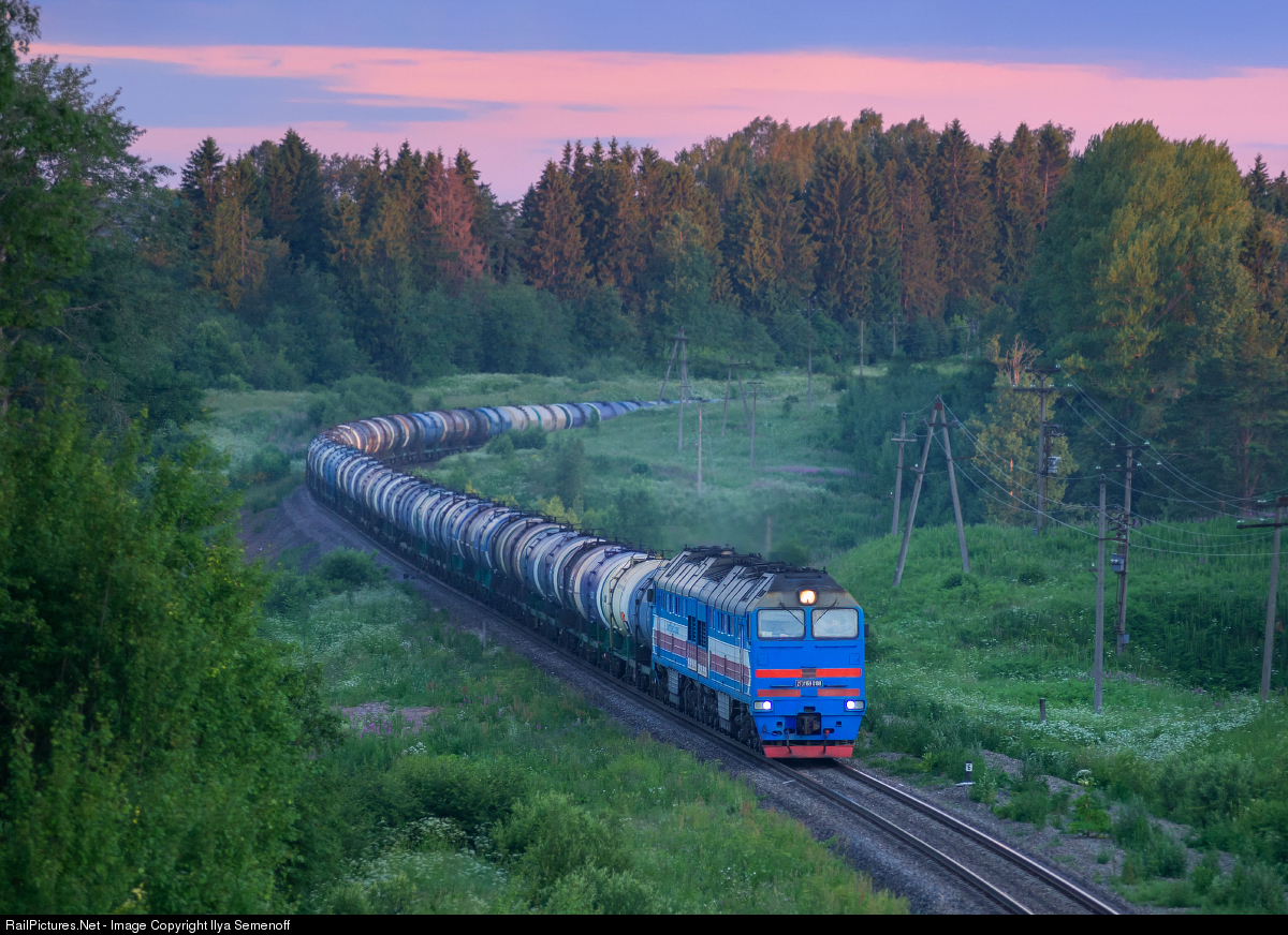 2TE116UD diesel locomotive with oil train goes ay early morning near Valday station, Novgorod region. This train belongs to a private company "BaltTransService" (BTS) affiliated by "Transnefteproduct". "BaltTransService" (БТС) is one of the largest private operators of oil cargo in Russia, the CIS and Baltic countries.