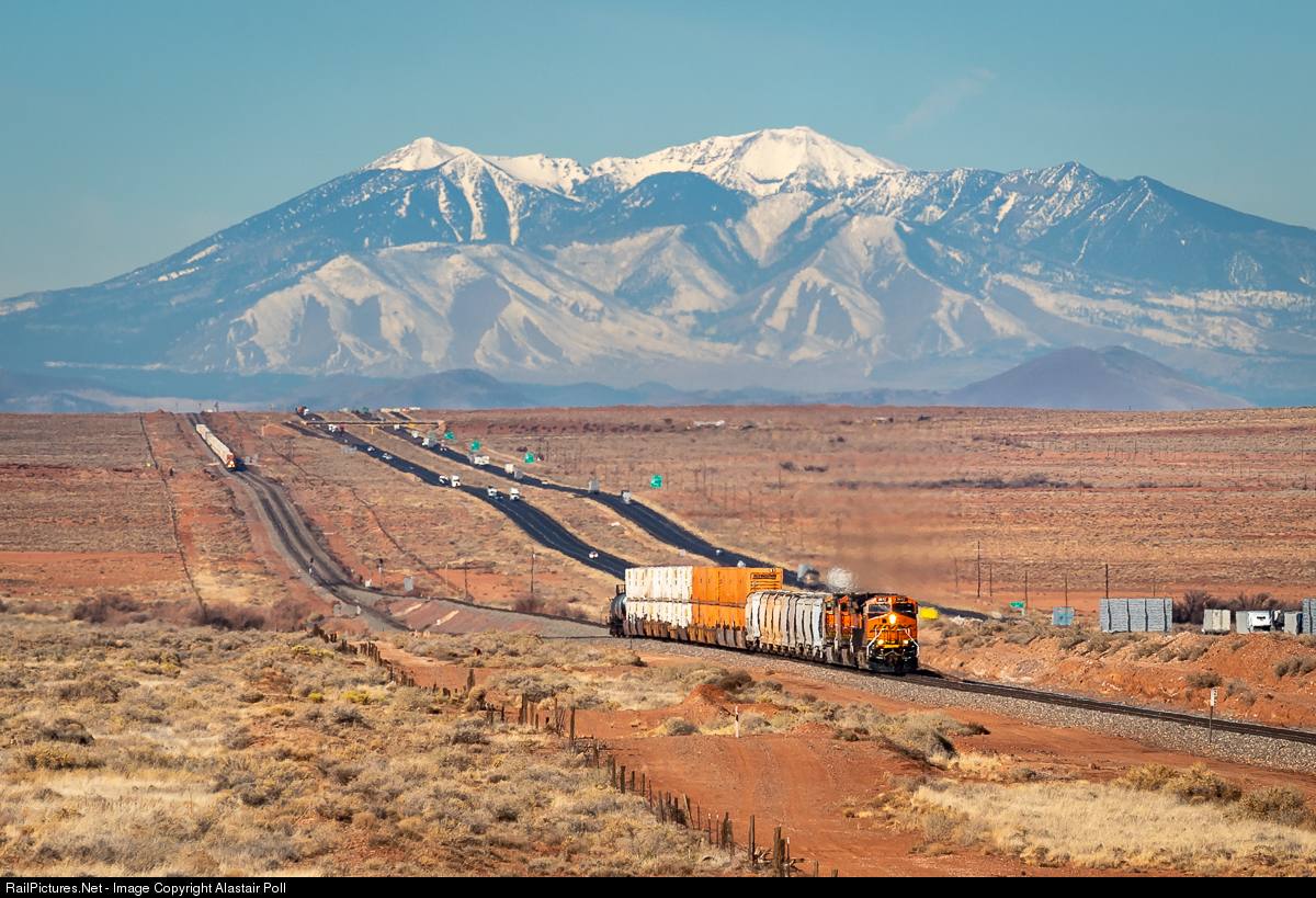 With the snow-capped San Francisco Peaks in the background, a baby Phoenix, AZ to Belen, NM manifest climbs the final grade into Winslow, AZ, while the San Bernardino, CA to Atlanta, GA Z Train can be seen in the distance also approaching Winslow on January 26th, 2020.