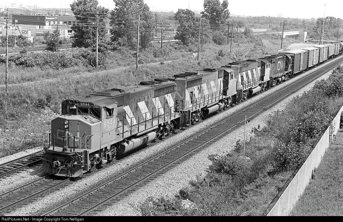 | On a fine summer day a westbound Canadian National freight out of Montreal glides through Lachine, Quebec, behind a trio of GP40-2s and a Century 424. |