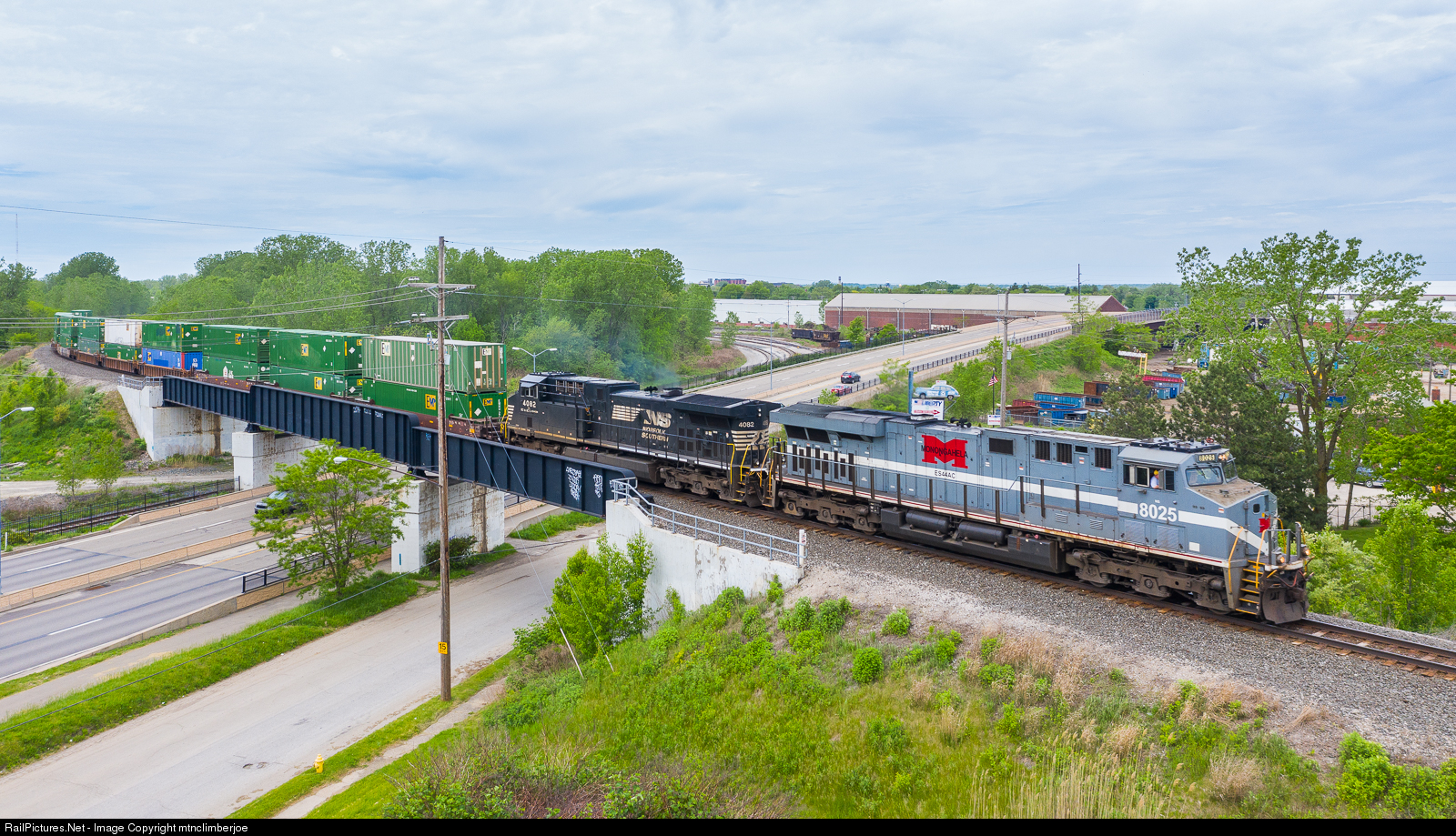 | The Norfolk Southern Monongahela heritage unit leads intermodal 22K as it heads east through Erie, Pennsylvania. The train is crossing the Bayfront Connector on a bridge built as part of the bypass of the former street running section on 19th Street. |