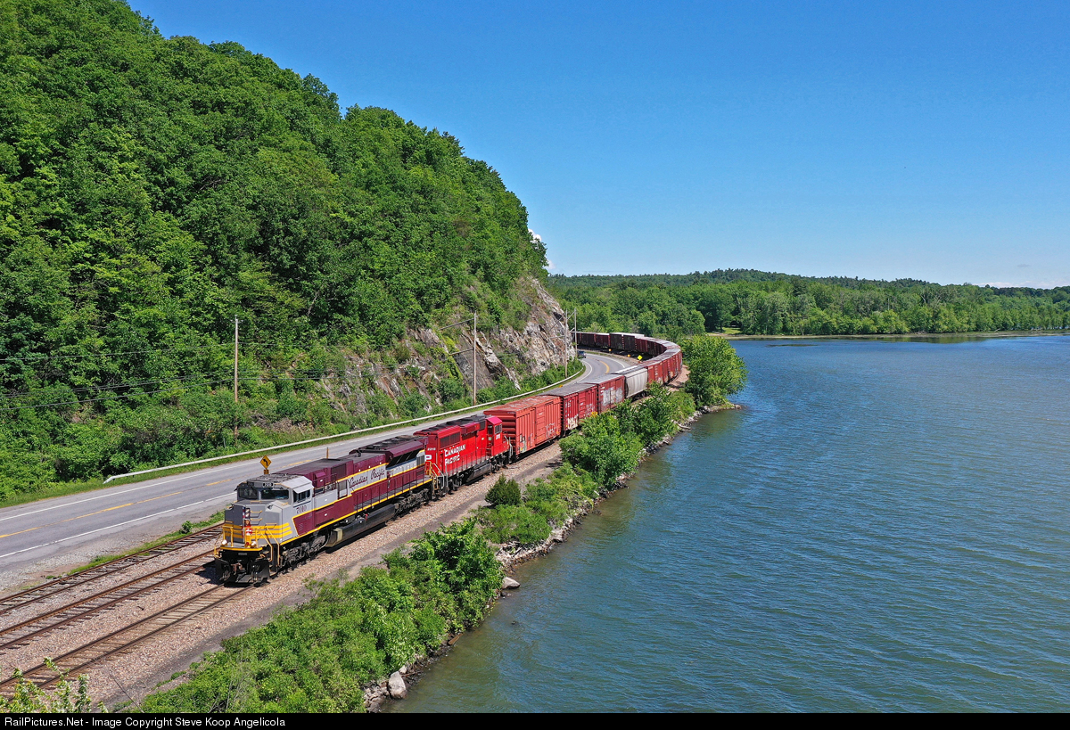 Canadian Pacific train 252 along Lake Champlain at Ticonderoga, NY. The 7010 heritage locomotive in original tuscan red, gray, and gold paint leads an extra long 9232 foot long train that also has a new SD70ACU rebuild as a mid-train dpu.