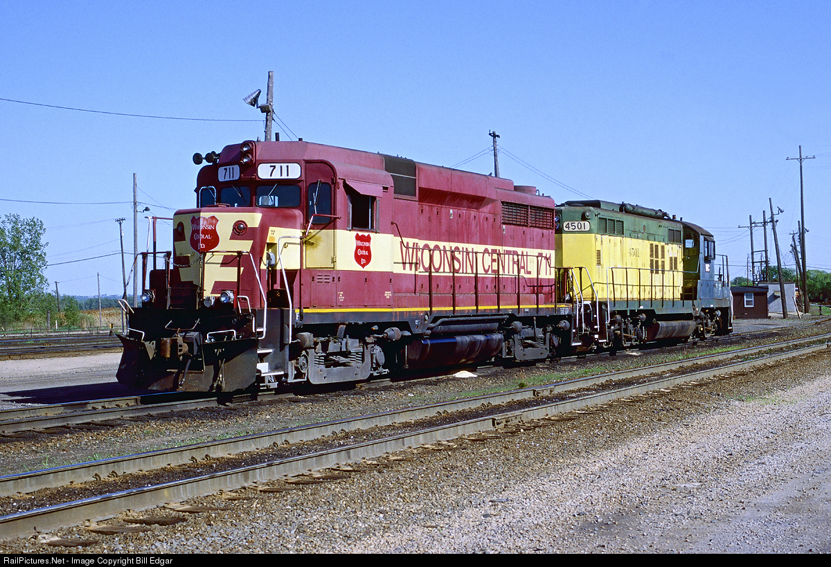 Railroad mergers often make strange bed fellows out of motive power. Who would have thought WC 711, a former Soo Line Alco trucked GP30 (same no.), would mate up with former Fox River Valley GP9 no. 4501, of Soo rival C&NW origin. The 4501 was built as CNW 1735 in June 1957, equipped with roof top torpedo tubes and a large fuel tank. CNW rebuilt it in Sept. 1972 with a chopped nose. The power is parked near the yard office at North Fond du Lac.