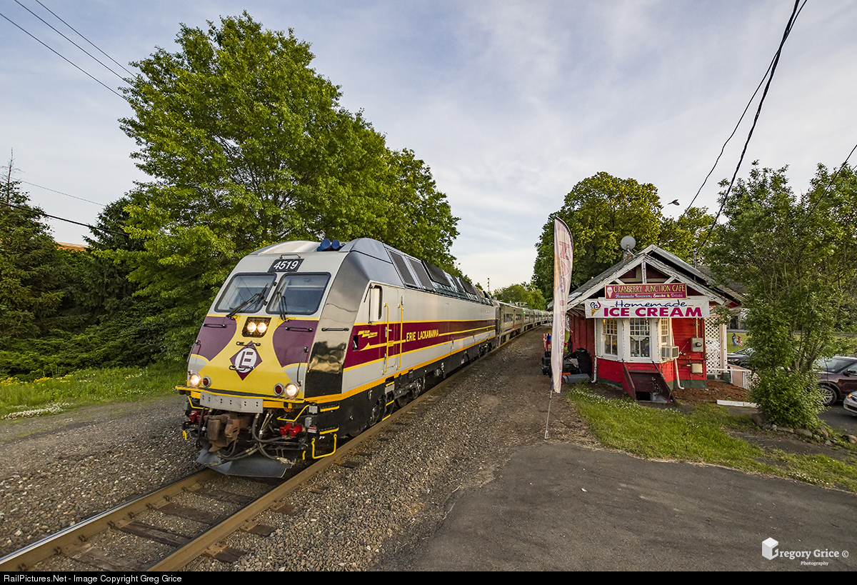 New Jersey Transit's Erie Lackawanna Railway Heritage ALP-45DP #4519 leads Pascack Valley Line train 9625 past the former Fairmount Avenue Station, now Cranberry Junction Cafe, in Hackensack, New Jersey. Fairmount Avenue Station was built 1870 as part of the extension for the Hackensack and New York Railroad. It was taken over by the Erie Railroad 1890s and New Jersey Transit in 1980. By 1982, the station was closed due to it's close proximity to the more favorable Anderson Street Station. The station house still stands as the Cranberry Junction Cafe.