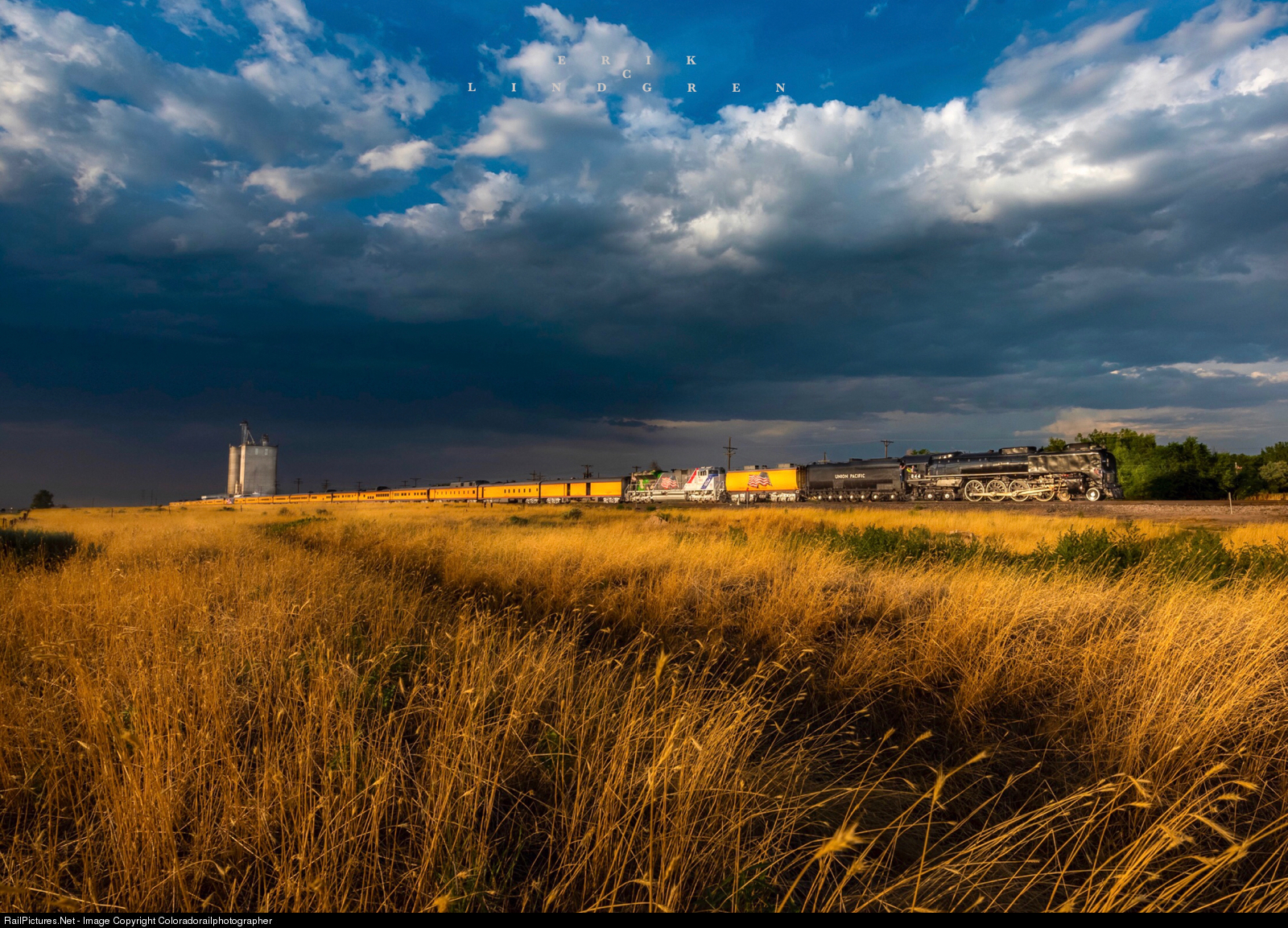 The last Cheyenne Frontiers Day Denver Post charter hustles past the Platteville, CO elevator into the beautiful storm light.
