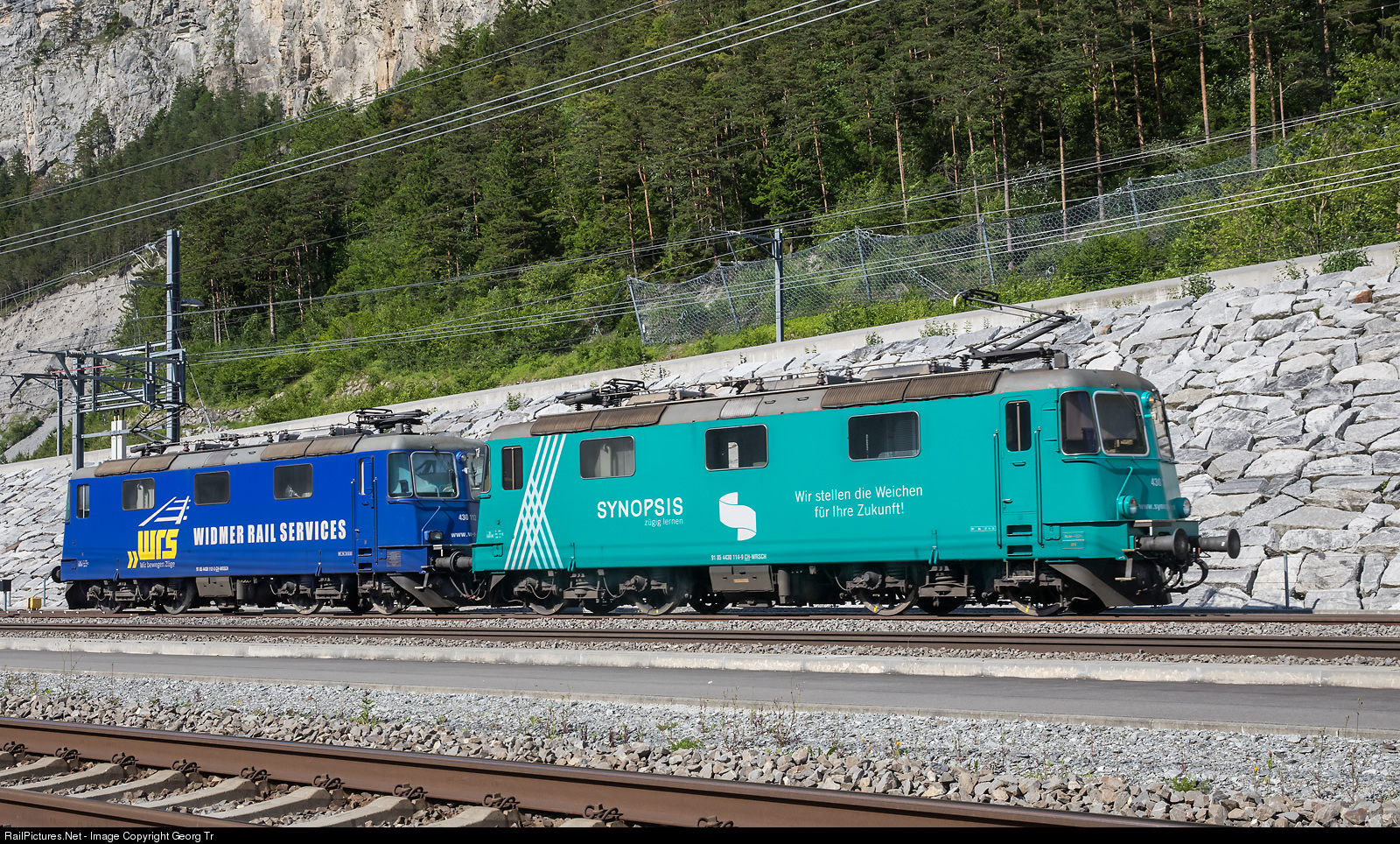 Re 430 # 114 in the Synopsis paint scheme and Re 430 # 112 of the Widmer Rail Services (WRS) are running light as 36881 from Basel via the Gotthard to Chiasso, entering the Gotthard Base Tunnel (GBT) in a few seconds at Rynächt near Erstfeld. The Re 430 # 114 was built as Re 4/4 III # 141 in 1983 for the Vereinigte Huttwil-Bahnen (VHB), was later Re 436 # 114 of the Regionalverkehr Mittelland (RM), then running for Crossrail. Since december 2017 owned by the WRS. The Re 430 # 112 was built in 1969 as Re 4/4 III # 112 for the Emmental-Burgdorf-Thun-Bahn (EBT), was later Re 436 # 112 of the Regionalverkehr Mittelland (RM), then running for Crossrail.The WRS bought the locomotive in march 2017.