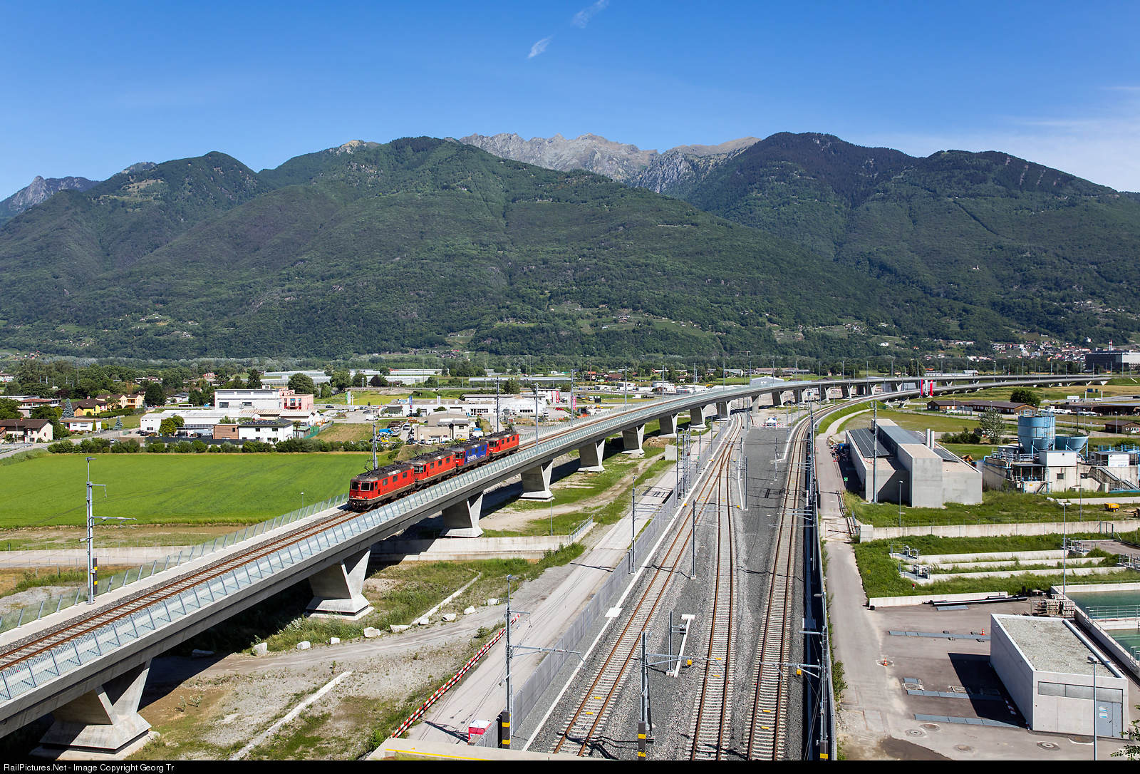 4 locomotives Re 420 (Re 4/4 II) of SBB Cargo in multiple traction, Re 420 # 259, # 291, # 288 and # 281, left the new 15 kilometer long Ceneri Base Tunnel near Vigana in the Magadino plane, running the test train 97230 from Vezia bifurcazione (near Lugano) to Giubiasco-Bellinzona San Paolo. Re 420 # 288 in the blue/red paint scheme has the inscription " Vorwärts. Unterwegs mit automatischer Kupplung und Bremsprobe effizient und sicher" (Forward. On the road with automatic couplers and brake test efficient and safe). Re 420 # 288 and # 291 (far right) were coupled with the automatic couplers, so there is a gap of more then half a meter between the buffers. The new Ceneri Base Tunnel (CBT) will be inaugurated on 4th of september and timetabled traffic will start in mid december of this year. The CBT is part of the NEAT (Neue Alpen Transversale), together with the 57 kilometer long Gotthard Base Tunnel (GBT), which opened in 2016 already.