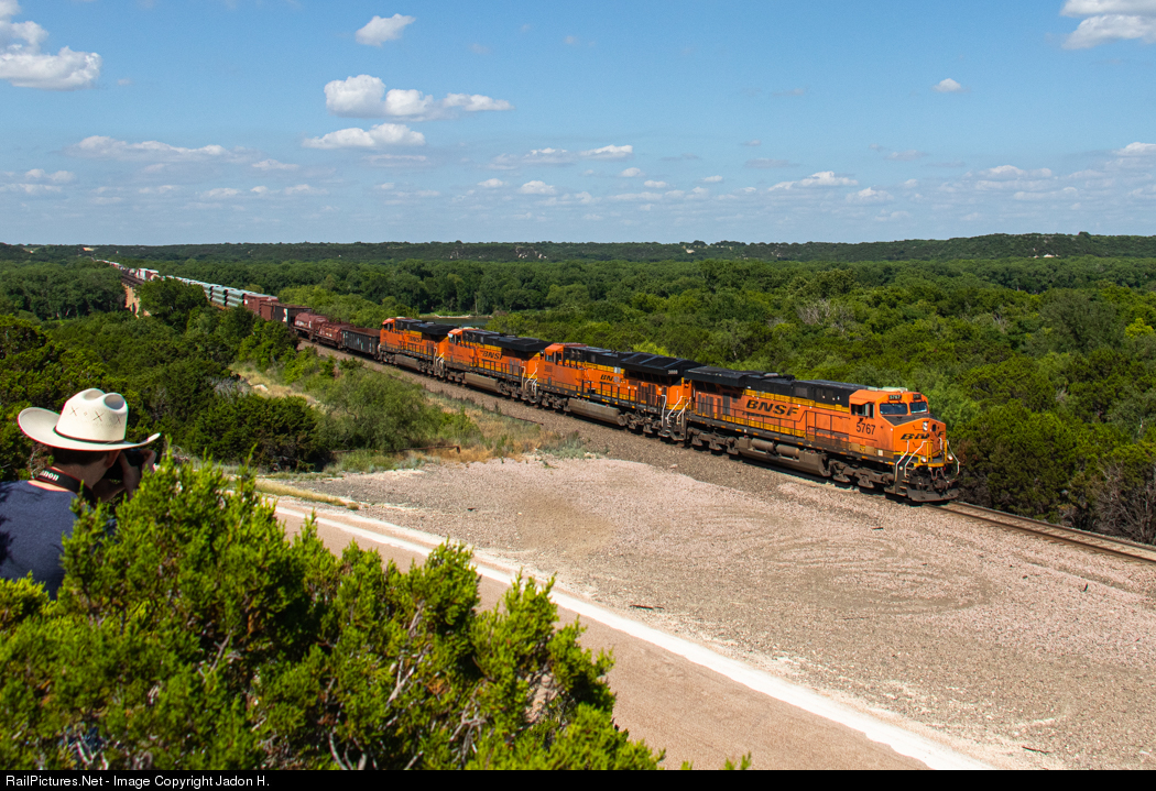 | As a fellow railfan snaps their own photos, BNSF 5767 leads a southbound manifest down the grade across Lake Whitney |