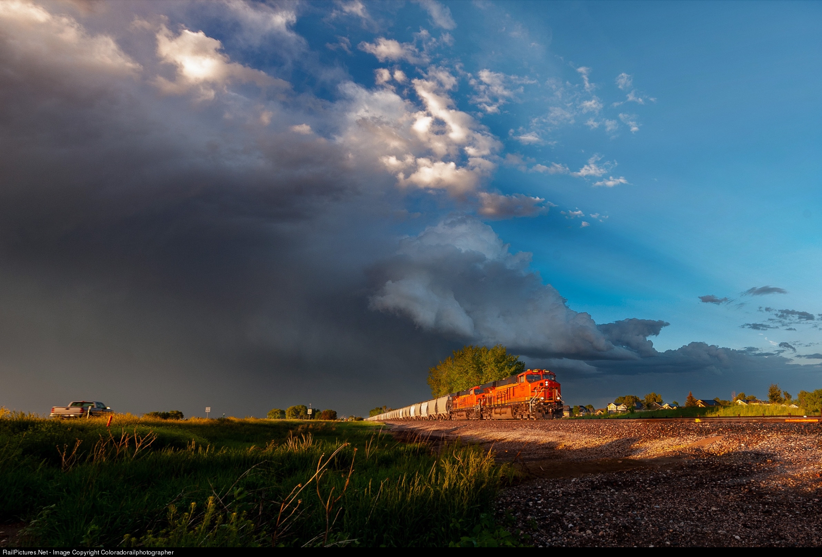 After punching the core in Longmont, CO of a severe warned thunderstorm, a southbound sand train with BNSF 7907 leading is along the Diagonal Highway emerging into the last sun of the day under a characteristically beautiful beaver tail cloud formation often found on HPC (high precipitation) spinning super cells. A rare and beautiful opportunity I am grateful for being able to be there to capture it with a clean BNSF train. |