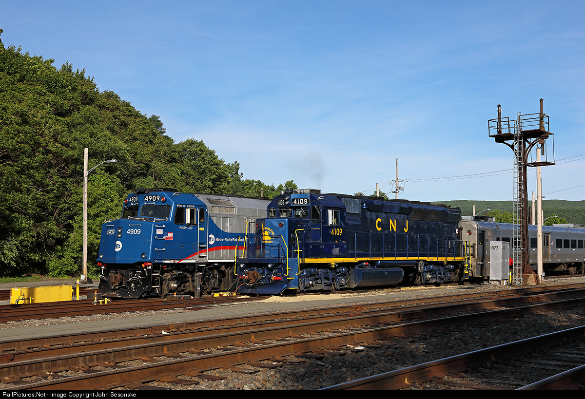 Framed by a Metro North West of Hudson F40, MNCW 4909, and an old Erie signal mast, the NJ transit CNJ heritage unit lays over in the former Erie Port Jervis yard. The unit has been restored to it's as delivered blue Central Railroad company of New Jersey scheme.