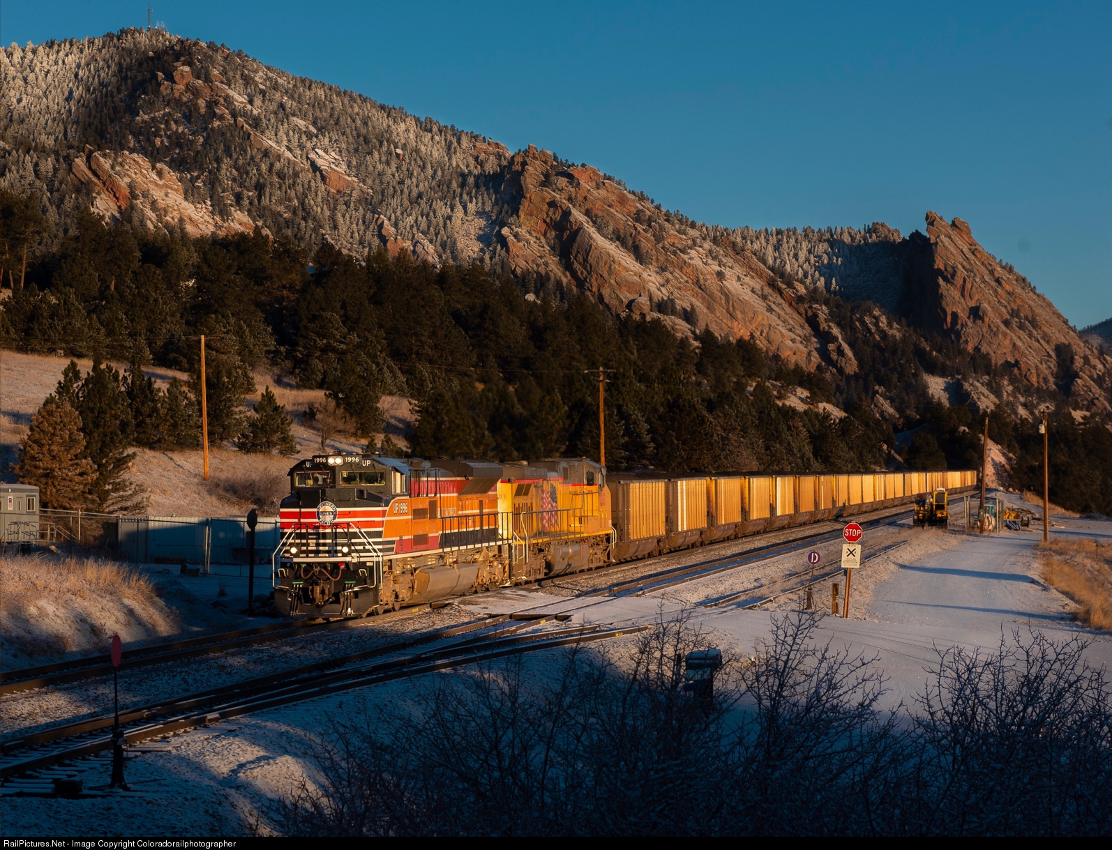 A fresh dusting of snow lines the track and touches the Flatirons minutes after sunrise just in time for Union Pacific’s glamorous Southern Pacific heritage unit in Daylight Red, Orange, and Black to glow in the morning sun leading an eastbound coal bucket that glints like fire. |