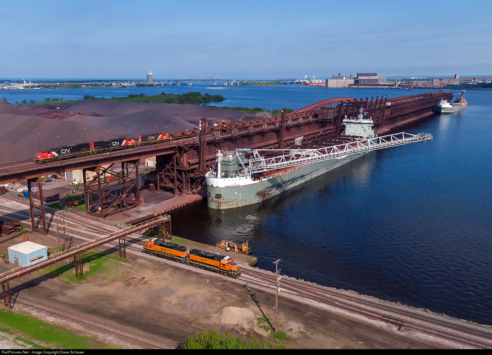 | A CN crew spots ore cars at ore dock number 6 while a BNSF switch job rolls past underneath. Two vessels from Canadian company Lower Lakes Towing are loading at the dock (Manitoulin and Michipicoten). |