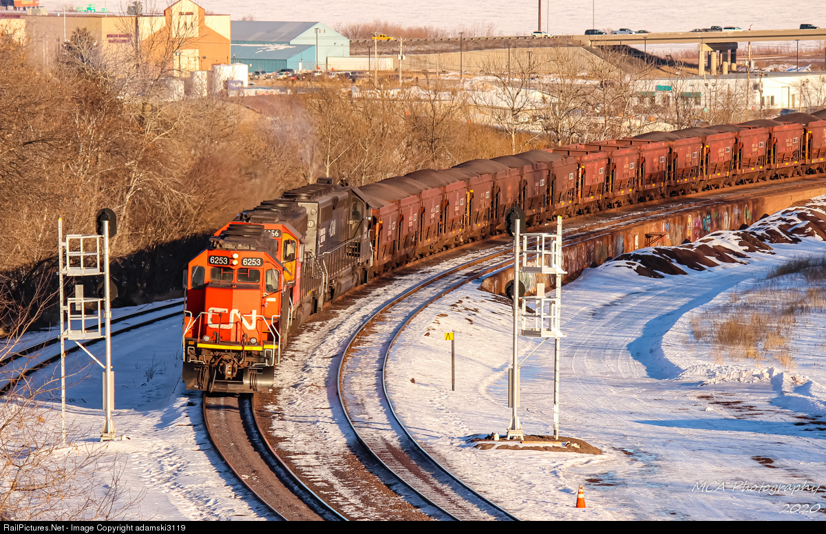| A trio of former IC SD40-3s ease empty ore jennies onto CN's Dock 6 in Duluth in nice golden hour light for the cars to be dumped, and pellets stockpiled, for the upcoming Great Lakes shipping season. |