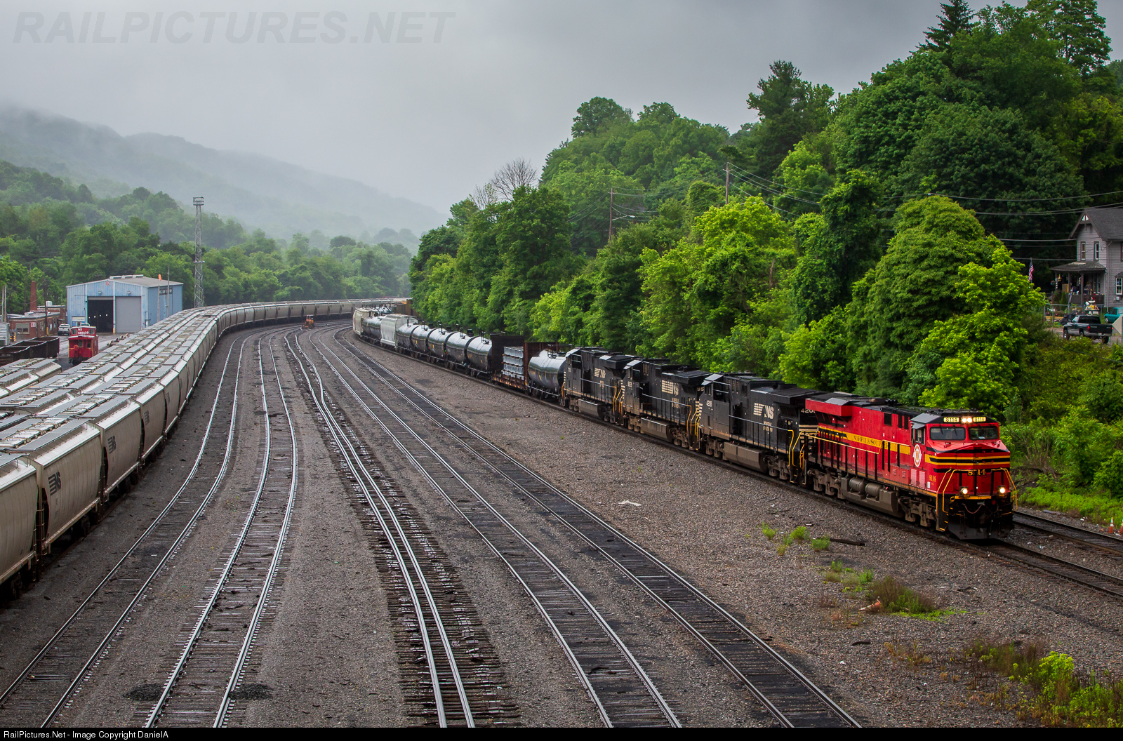 After chasing from Roanoke, Va to Bluefield, Wv, NS 19M has finally made it's way into Bluefield yard. A quick crew change will take place and onto the Pocahontas district it will go. Also on this day crews were working to take up one of the tracks in the yard.