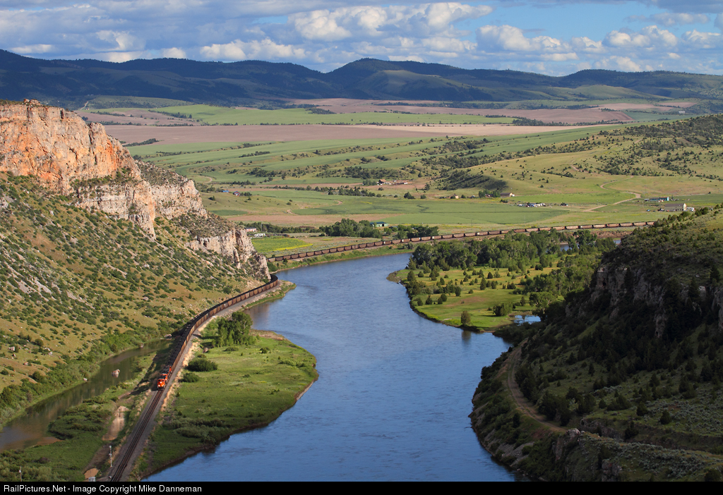 A westbound BNSF coal train led by an EMD SD70Ace heads west along the Missouri River into Montana’s Lombard Canyon approaching Lombard siding on the afternoon of June 30, 2018.