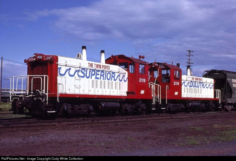 | Soo Line SW9s 2119 and 2118 picking up a transfer from the BN at Rices Point Yard in Duluth July 1980. These SW9s were built in September 1953 for the original Wisconsin Central. The 2119 was painted into the "Superior" scheme in October 1978 and the 2118 received the "Duluth" scheme in the fall of 1979. Not long after this photo was snapped, these switchers were painted back to the standard Soo Line scheme and returned to working out of Schiller Park. John C. Benson Photo from my Collection. |