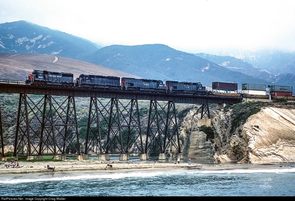 A westbound (heading compass north) Southern Pacific intermodal train passes over Gaviota Creek, led by Cotton Belt GP60 9626, SP SD45R 7484, SP SD45T-2 9242 and SP SD40T-2 8327. As should be obvious, this is SP's Coast Line, skirting the Pacific Ocean from Ventura to Surf. Gaviota, located in southern Santa Barbara County, about 33 miles (53 km) west of the city of Santa Barbara, between the ocean and the Santa Ynez Mountains, features a long, tall steel trestle over Gaviota Creek as it empties into the Pacific. ("Gaviota" is Spanish for "Seagull.") This 80-mile (130 km) section of the SP’s Coast Line was completed between Surf and Santa Barbara in 1900, although more track needed to be laid before the line would reach Los Angeles. As is common between April and September, a Catalina Eddy (aka "Nature's Air Conditioner") has moved cloud cover from the Pacific to the shore. This overcast will burn off later, exposing the clear, blue skies synonymous with southern California. (Gaviota, California – September 13, 1992)