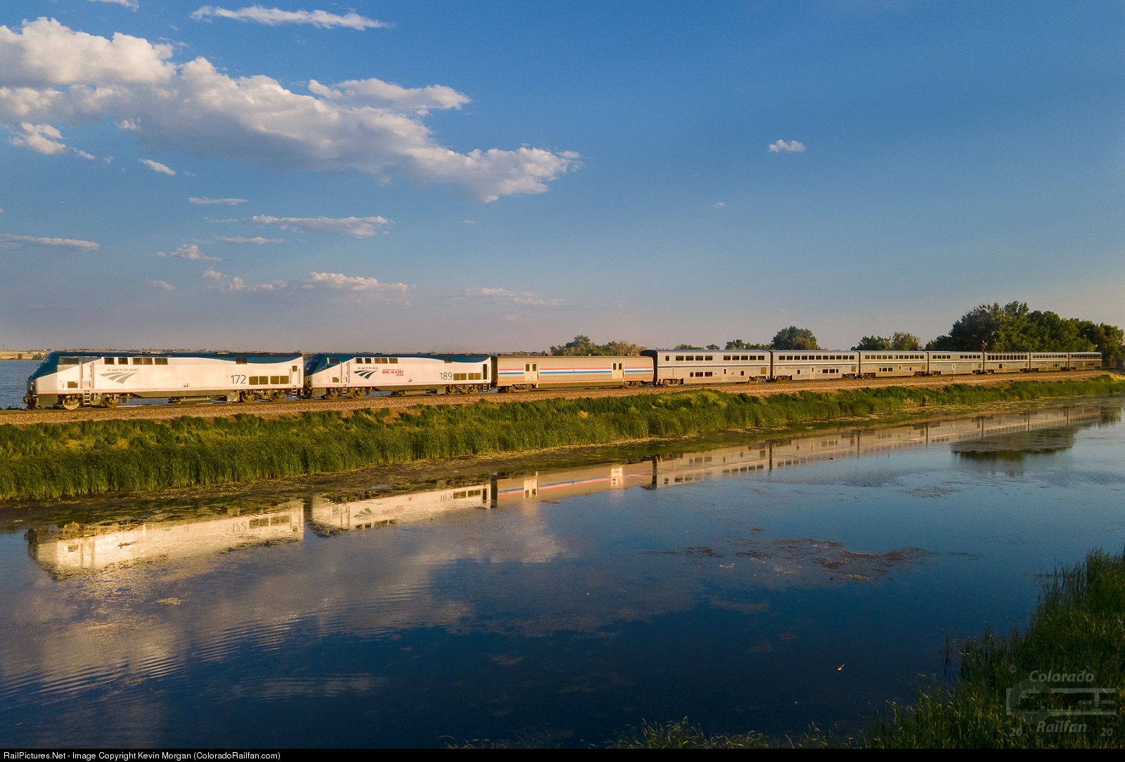 For much of the year, the eastbound Zephyr departs Denver after dark. However, in the summer months, there is still a bit of light when it heads east. Here, just days before the official start of summer, the Chicago-bound train is right on time as it passes by Barr Lake, about 18 miles east of Denver Union Station.