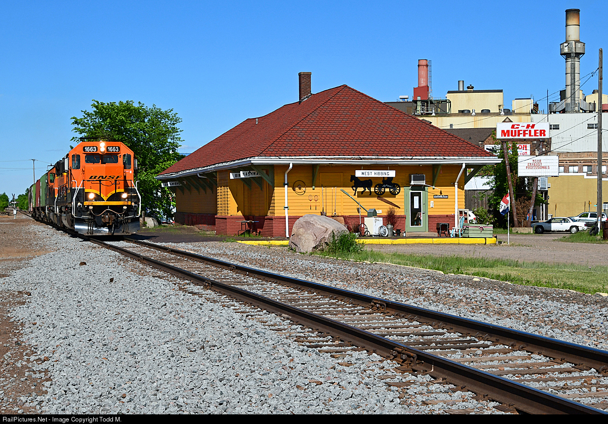 | Due to congestion on the CN, a late-running Kelly Lake Local coming back from the Minorca mine with five empty bentonite cars slowly cruising by the former GN depot in Hibbing, MN on a Friday afternoon.