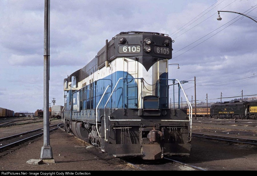 Burlington Northern SD9 6105 resting between assignments at Hillyard April 1970. Built as Great Northern 578 in February 1954 and retired in June 1986. On the right side of the photo is SP&S 750, the only E7A rostered by the SP&S. Unknown Photographer Photo from my Collection.