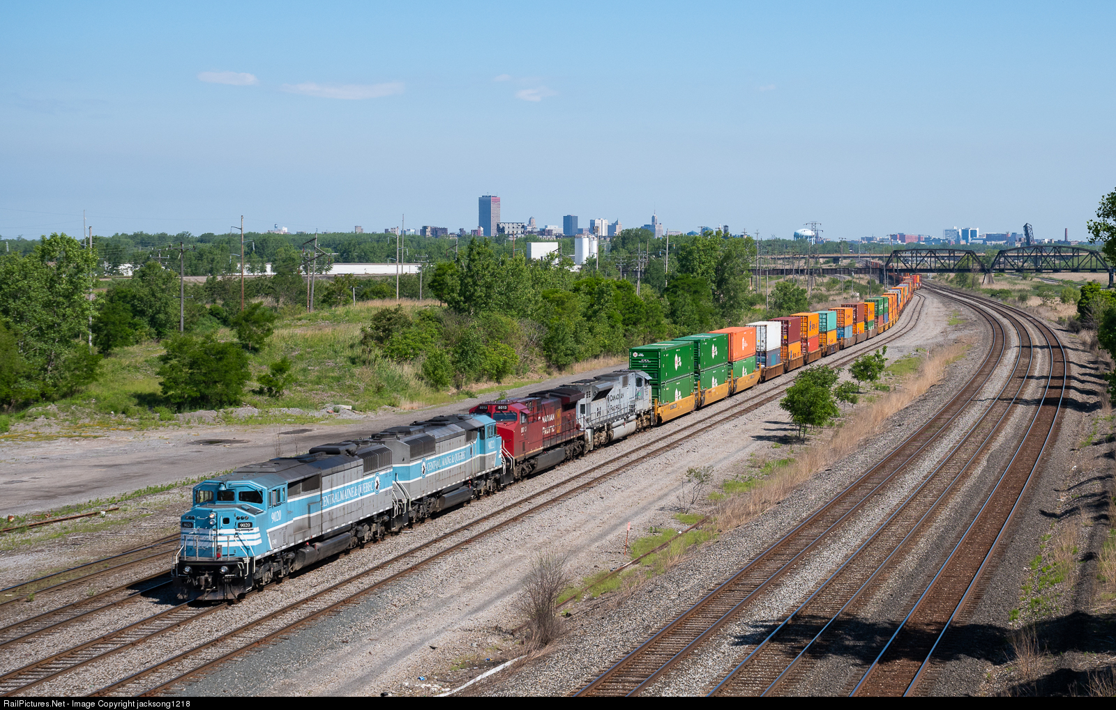 Canadian Pacific train 143 (Montreal, QC - Buffalo, NY) has a pair of Central Maine and Quebec EMD SD40-2F's leading a GE AC44CM rebuild and CP 7023 the Air Force Heritage unit, providing for an unusual and fantastic consist. The train is seen here from the Ridge Road overpass as it enters CSX's Seneca Yard to do some switching with the Buffalo skyline in the background.