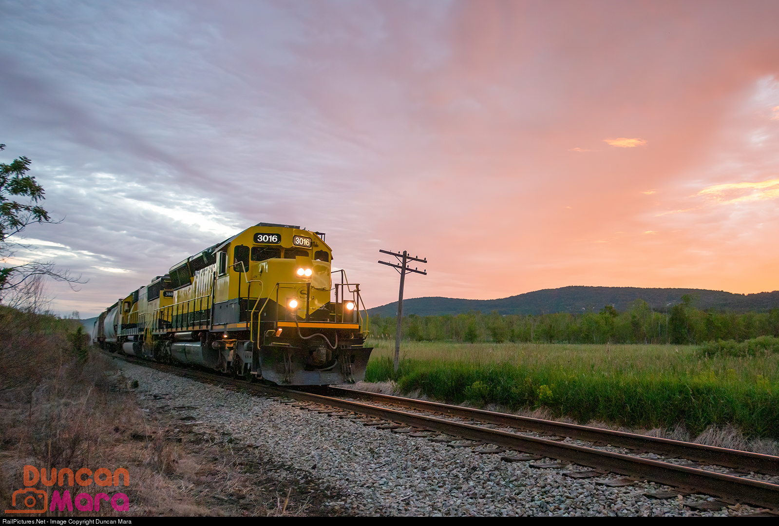 NYS&W SU-99 rolls north through Vernon Flats at sunset along the former Lehigh and Hudson River Railway.