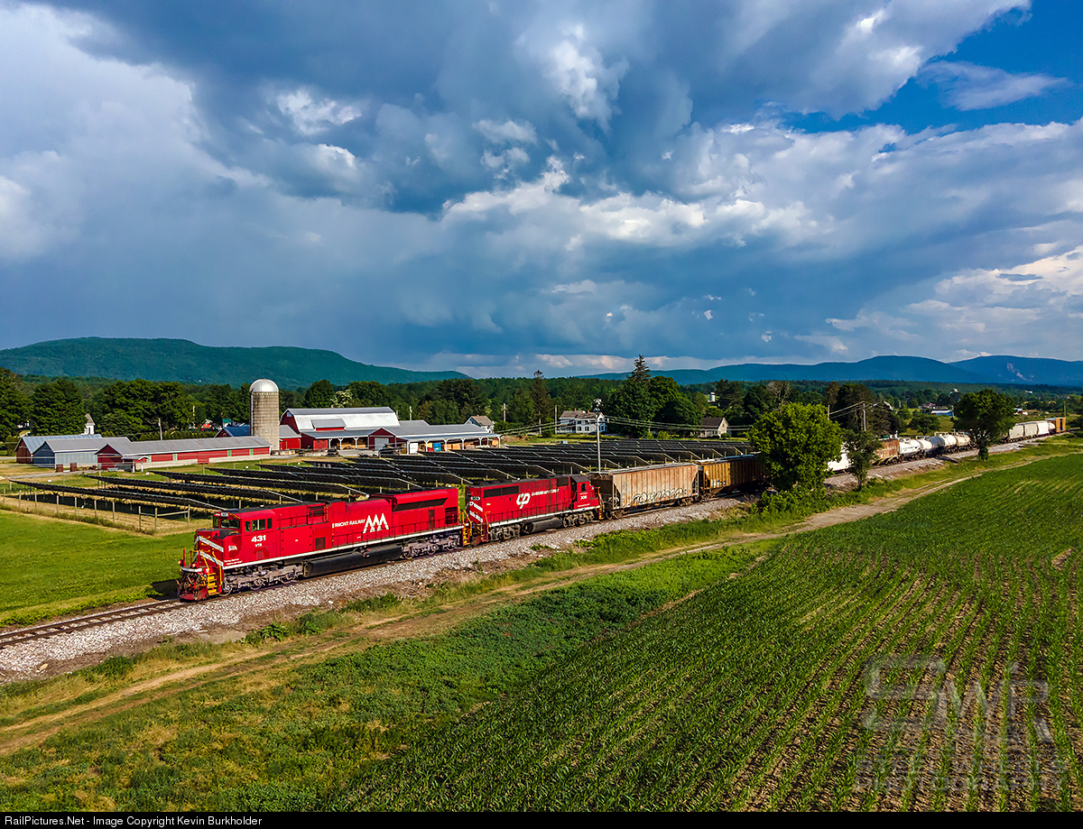 Vermont Railway’s Hoosick Jct., NY to Rutland, VT train HJRD-23 is rolling through North Clarendon, VT as thunderstorms accumulate over the Green Mountains. The HJRD is led by VTR SD70M-2 431 and CLP GP40-2 306.