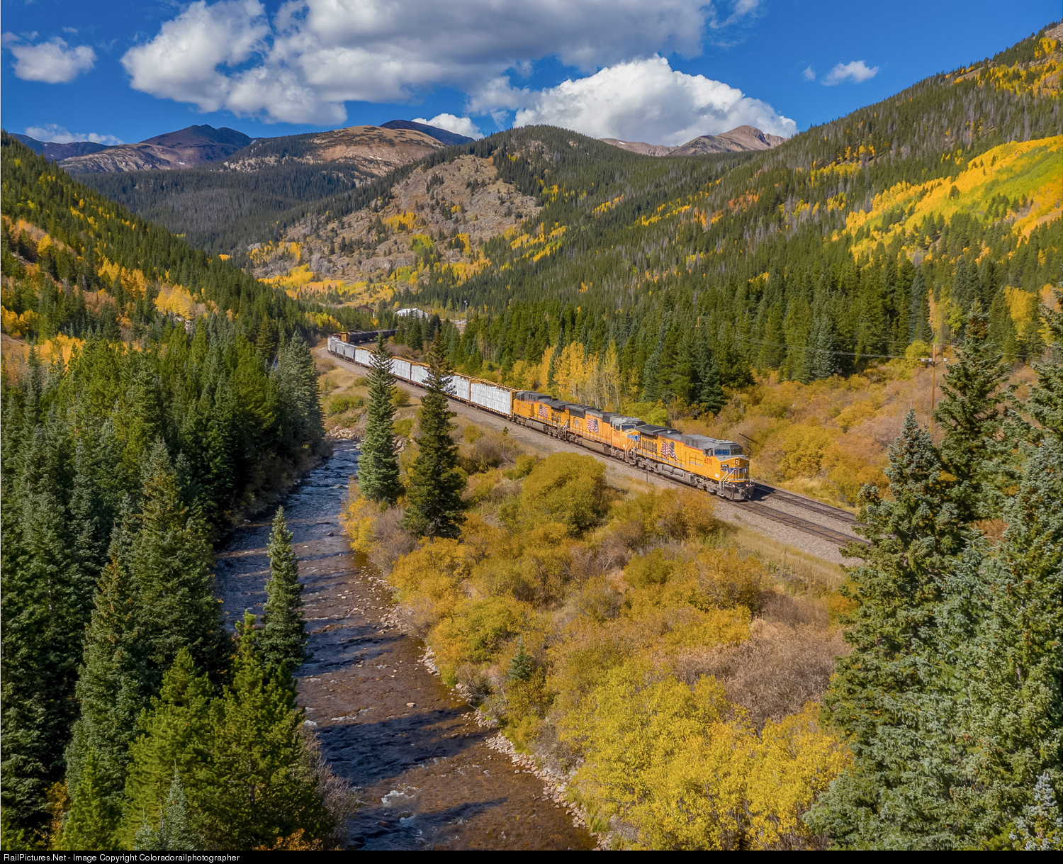| Aspens and all the foliage in full peak Fall color line the picturesque valley east of Rollins Pass and the Great Divide. The Union Pacific maintains the main line railroad that goes through the Rockies not around them. It’s hard to imagine the Rollins Pass line once went over those 14,000 foot peaks. The MGJNY is gently rolling along on this intense late morning among the Aspens and South Boulder Creek in East Portal. Shot on Inspire 2. |