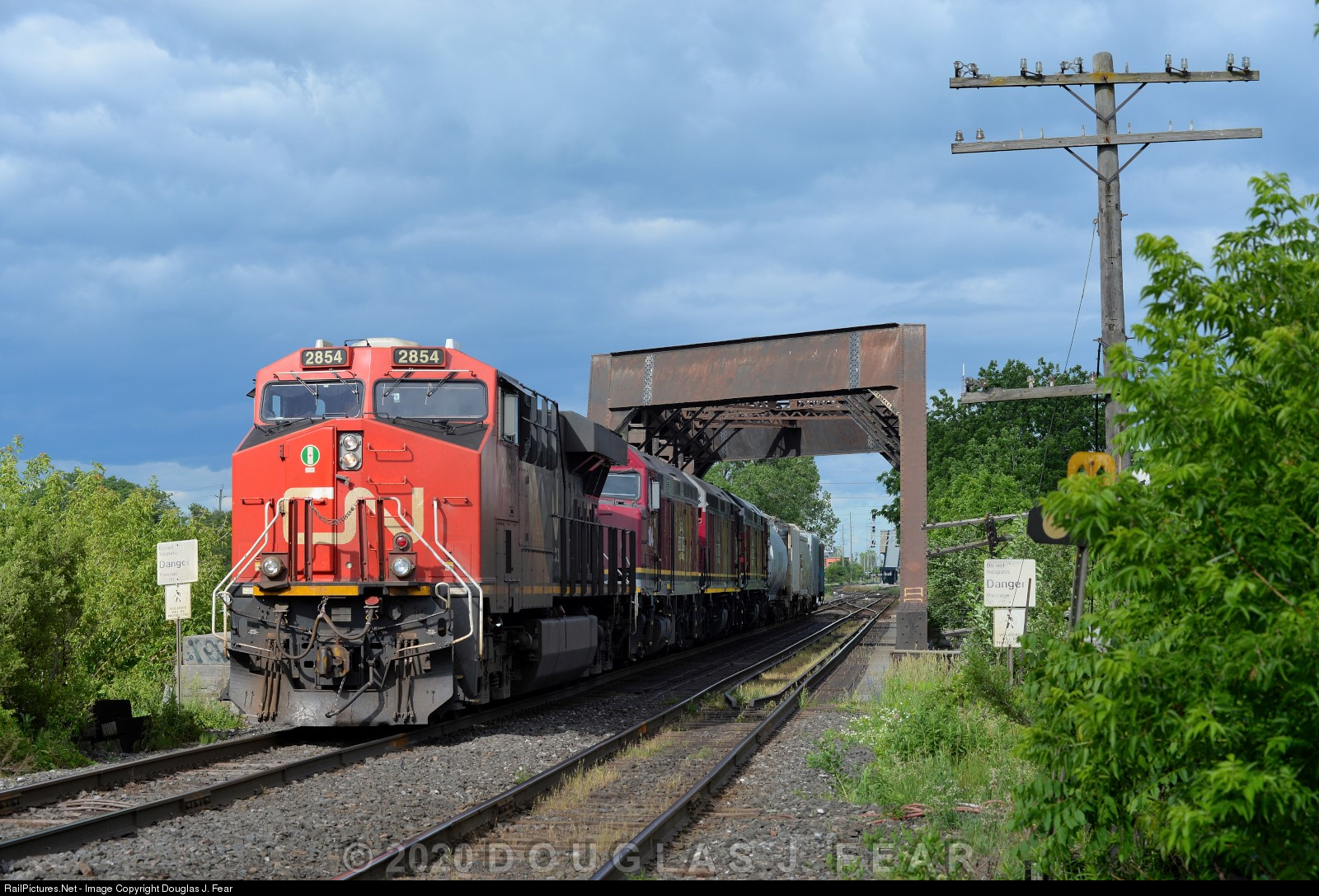 | CN 369 lifts cars from Belleville yard with the three Agawa Canyon Tour F40PHRs dead in tow. The three F40PHRs are enroute to destination unknown, since the Tour Train may be cancelled this year. Speculation is that they may be headed to Sault Ste. Marie to protect the tour train should it be decided to run during the Covid Epidemic. Shown here crossing the Moira River with their new lift after a crew change. CN Kingston Subdivision. |
