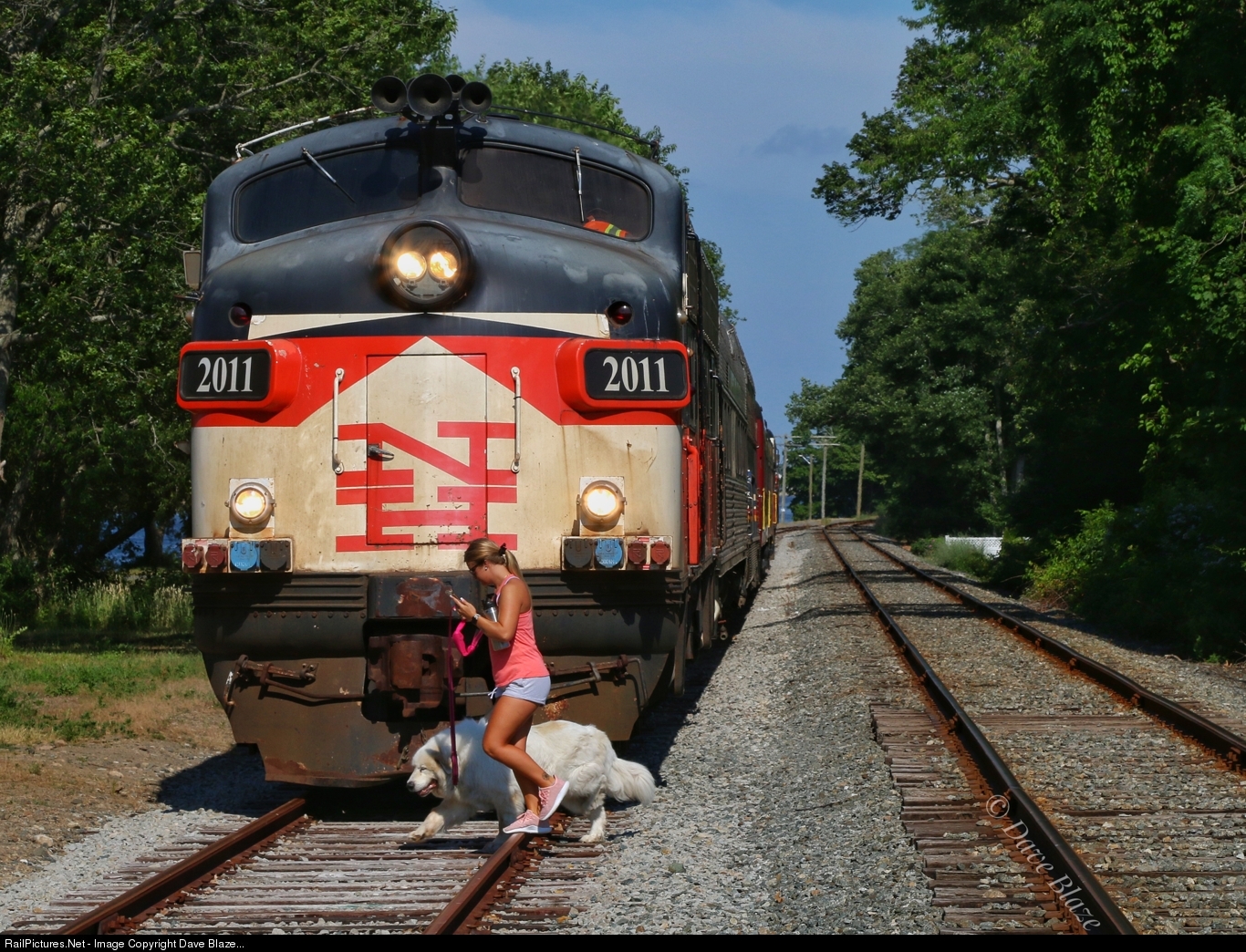 The ditch lights and headlights were left on the rear here for the benefit of the photographers creating the illusion of movement. But the train was safely stopped and this local and her dog were crossing at a known path that leads from the village to the long linear park along the edge of the Cape Cod Canal.