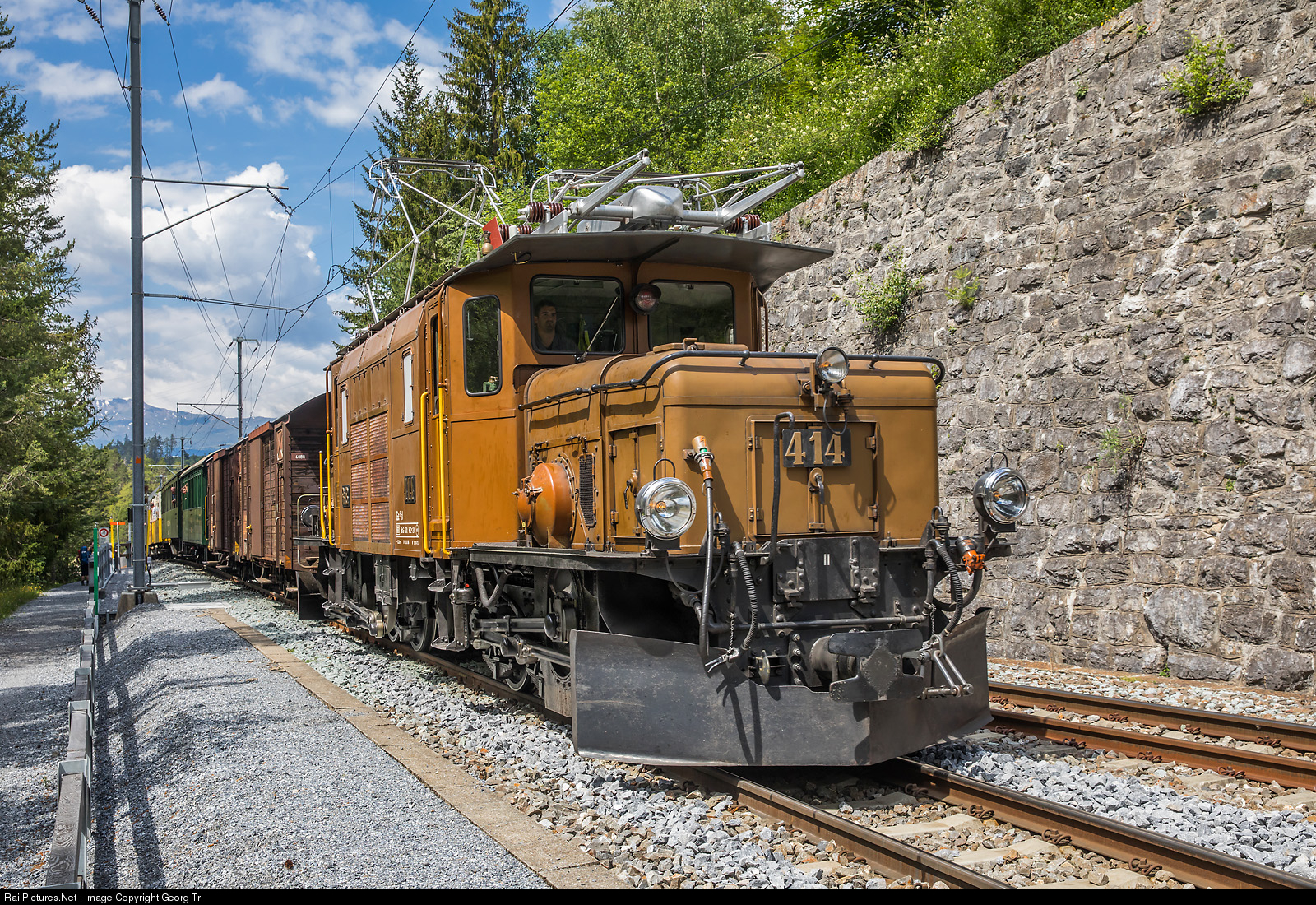 "C-C" or "Rhaetian Crocodile" Ge 6/6 I # 414, built in 1929, is entering Davos Wiesen, pulling the nostalgia train R 1822 from Filisur to Davos Platz, with beautiful vintage cars and two open observation cars in the middle. The train run twice daily during the summer months, replacing a modern timetabled train, usuable with any valid ticket without surcharge.